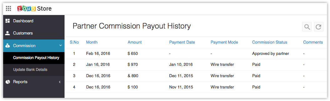 Zoho Store account once you sign up for Zoho Developer. All your commission details will be available here.