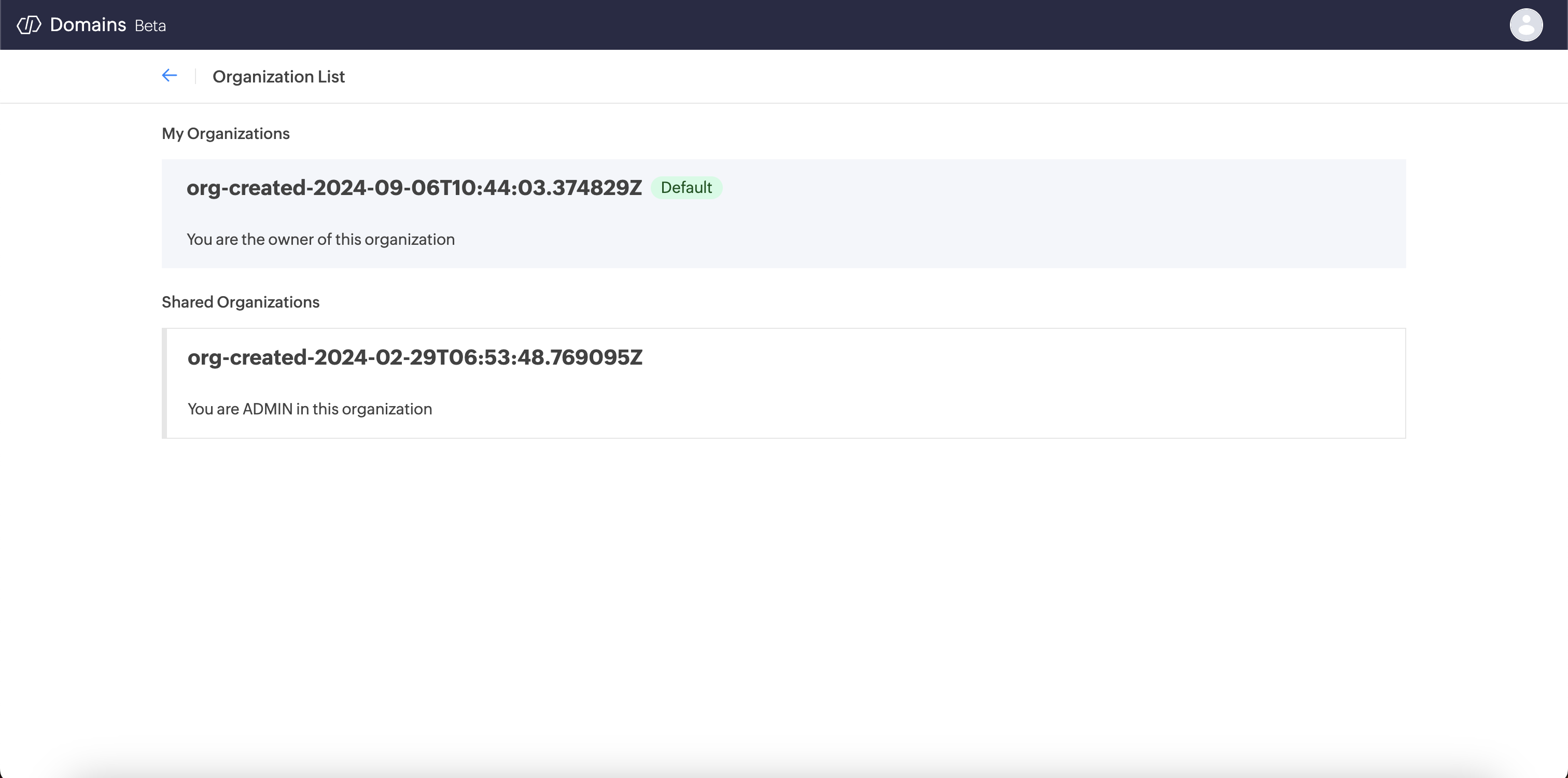 All organizations you have access to will be displayed here. If you have access to shared organizations, they will be listed under the Shared Organizations section.