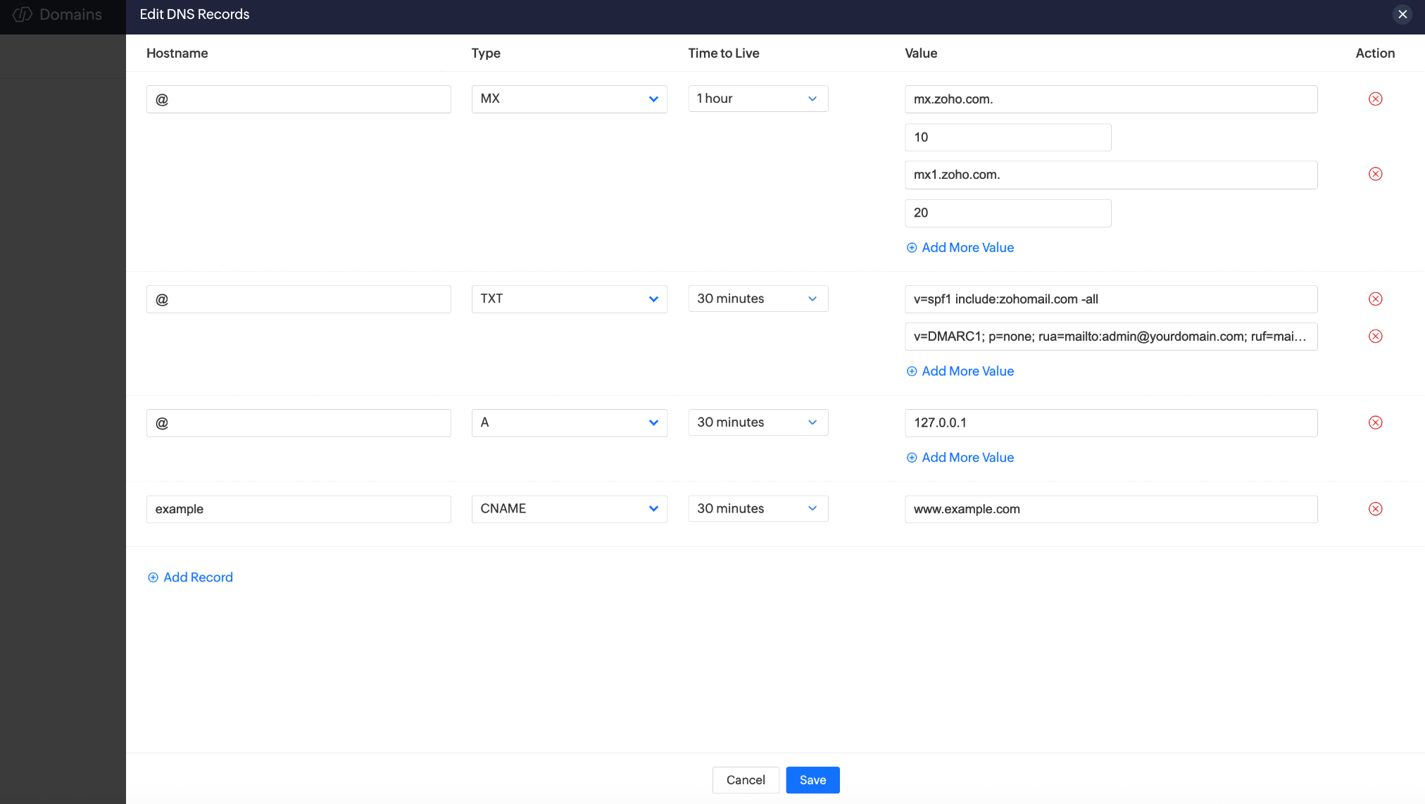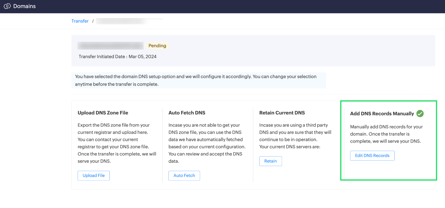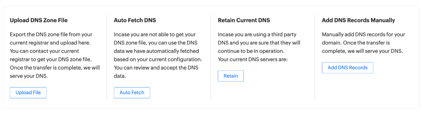 When transferring your domain to Zoho Domains, you can choose from the following methods to configure your DNS records: