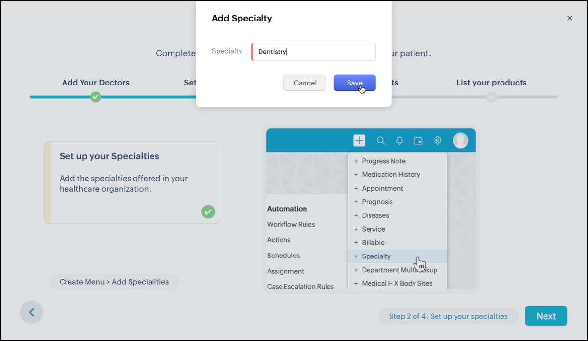 Once you have created user profiles for your doctors, the next step is to set up specialties for your healthcare organization.
