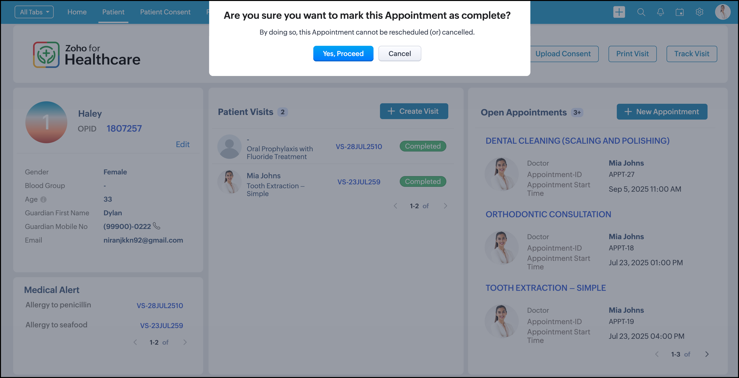 5. Click Yes, Proceed. Your patient appointment is now marked complete.