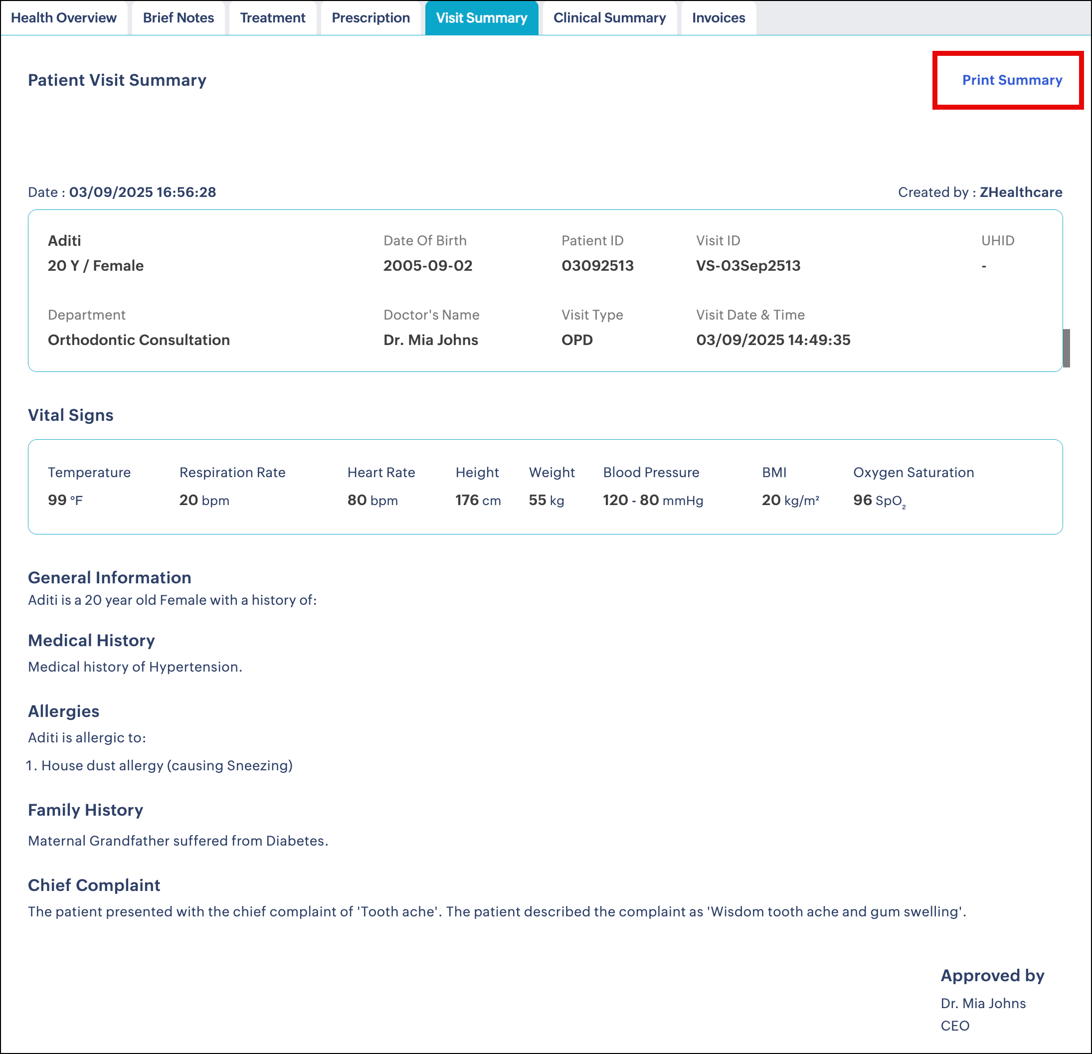 How to view and print patient visit summary using practice management software | Zoho for Healthcare