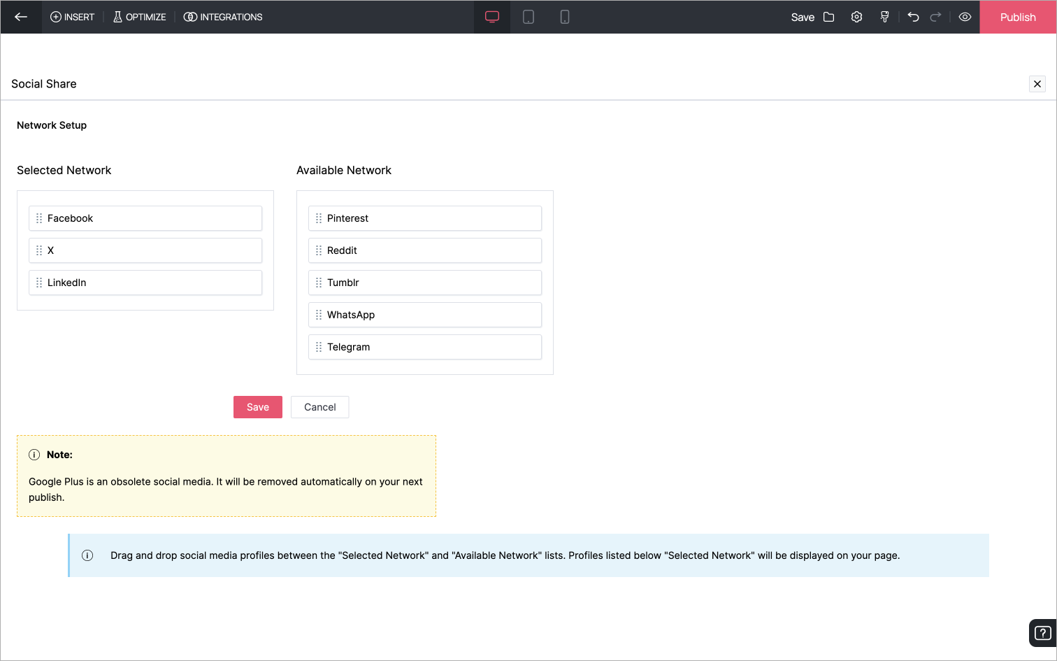 4. In the Social Share settings window, you can click and drag social networks from the Available Network column to the Selected Network column. Once you have selected all the required social networks, click on Save.