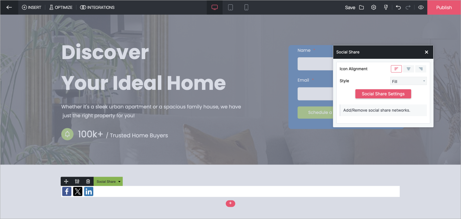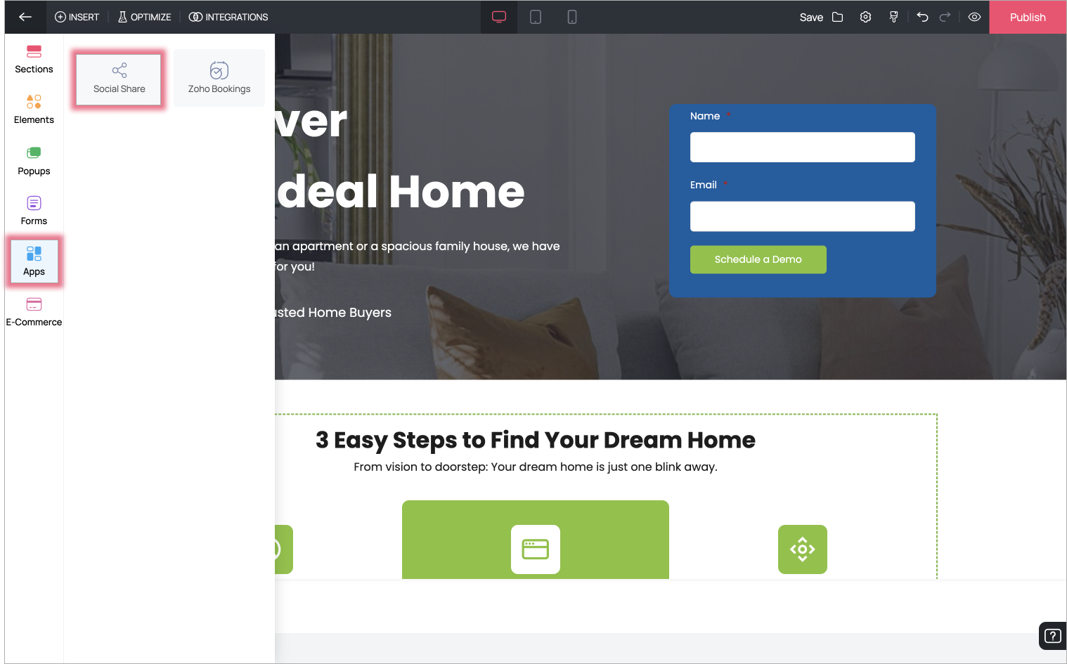 2.  In the menu, click on the Apps tab and choose the Social Share option to be inserted in your landing page.