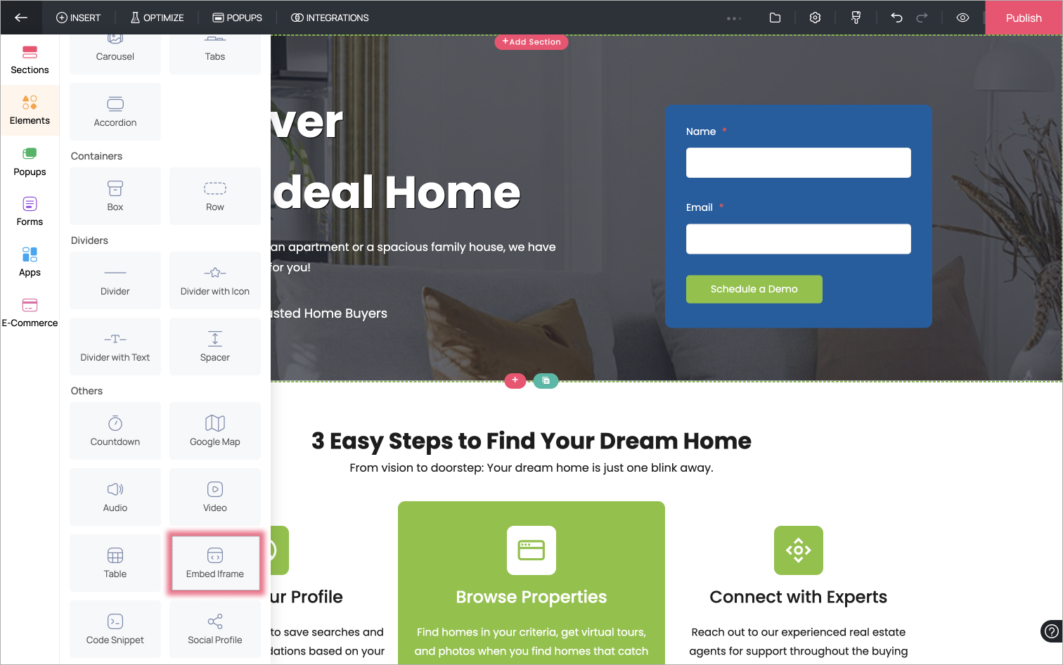 2.  In the menu, click on the Elements tab and choose the Embed Iframe element to be inserted in your landing page.