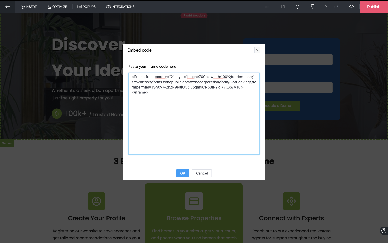 3. Paste the code of any element that you want to be embedded such as forms, documents, or videos and click on the OK button.