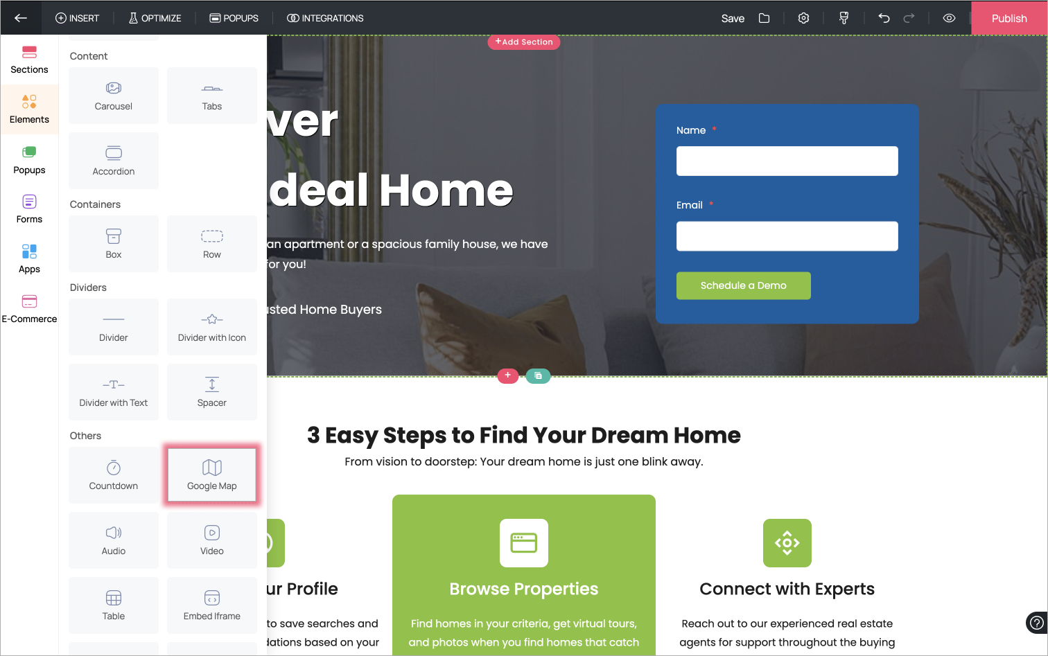 2. In the menu, click on the Elements tab and choose the Google Map element to be inserted in your landing page.