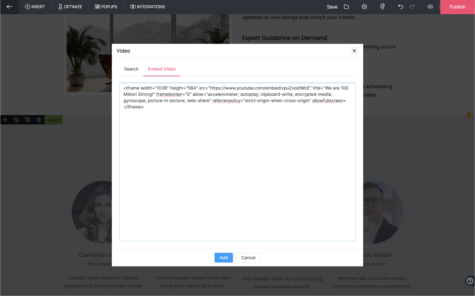 4.   Choose one from the displayed list of videos and click on Add to insert the video in your landing page.