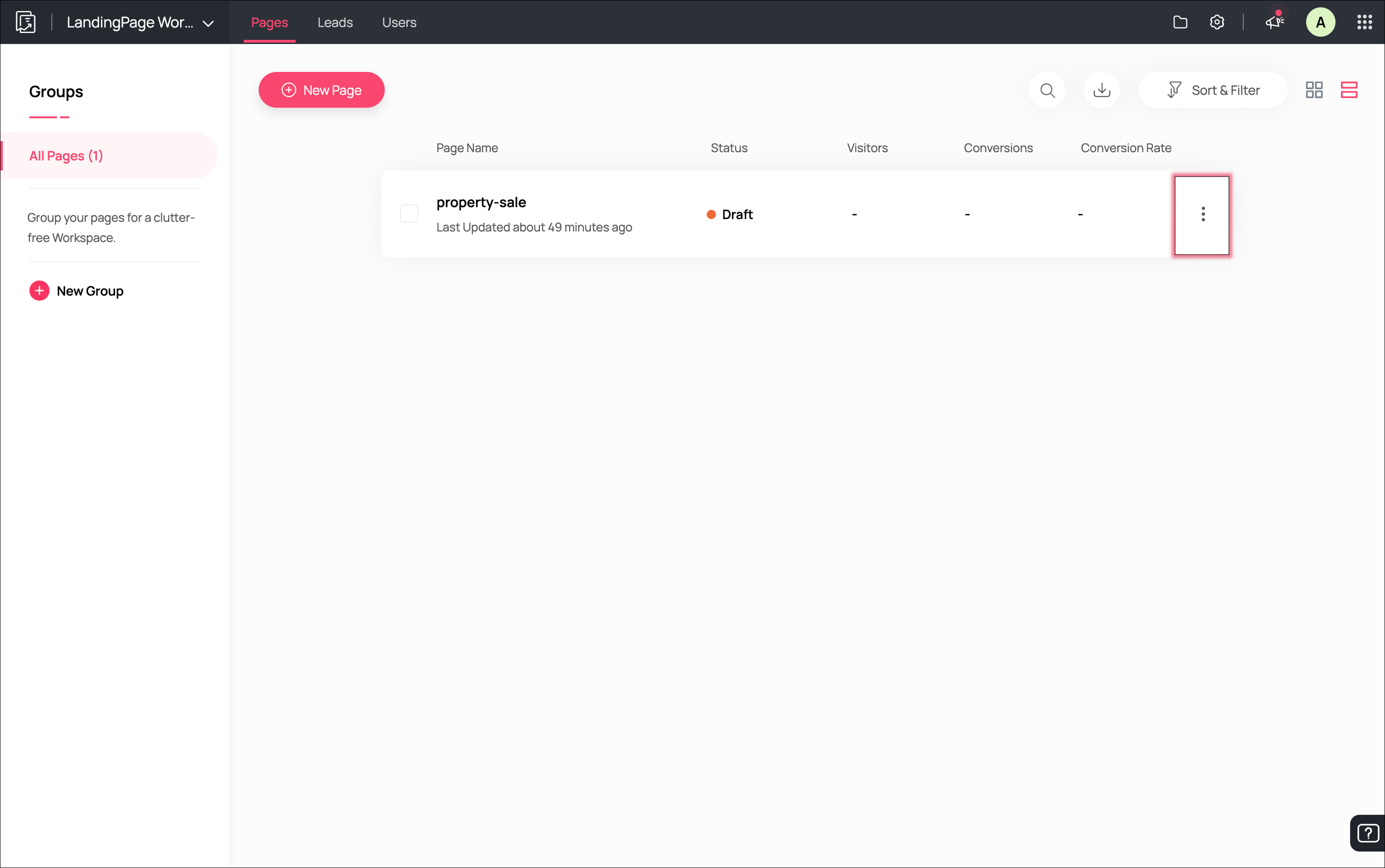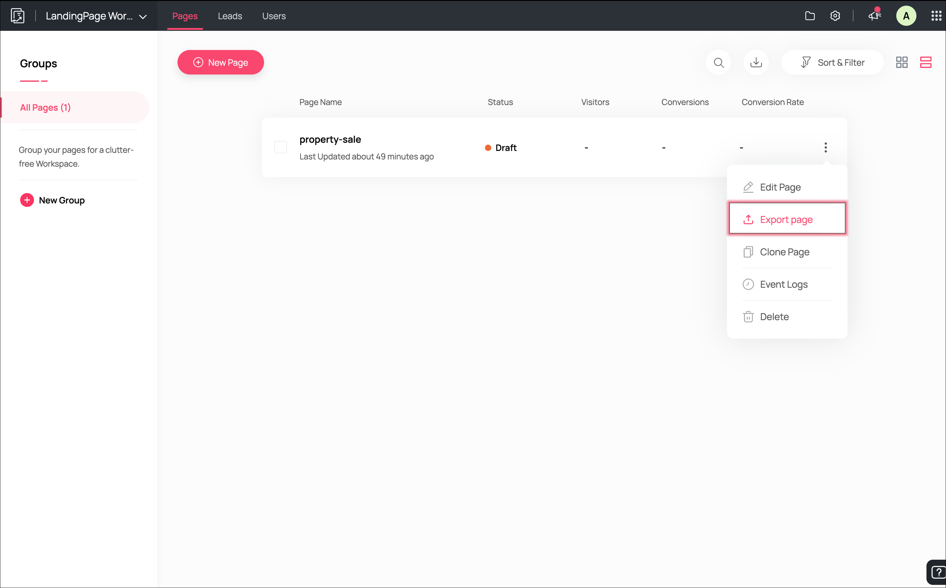 1. To export any landing page in your workspace click on the three-dot menu next to the landing page to display the menu.