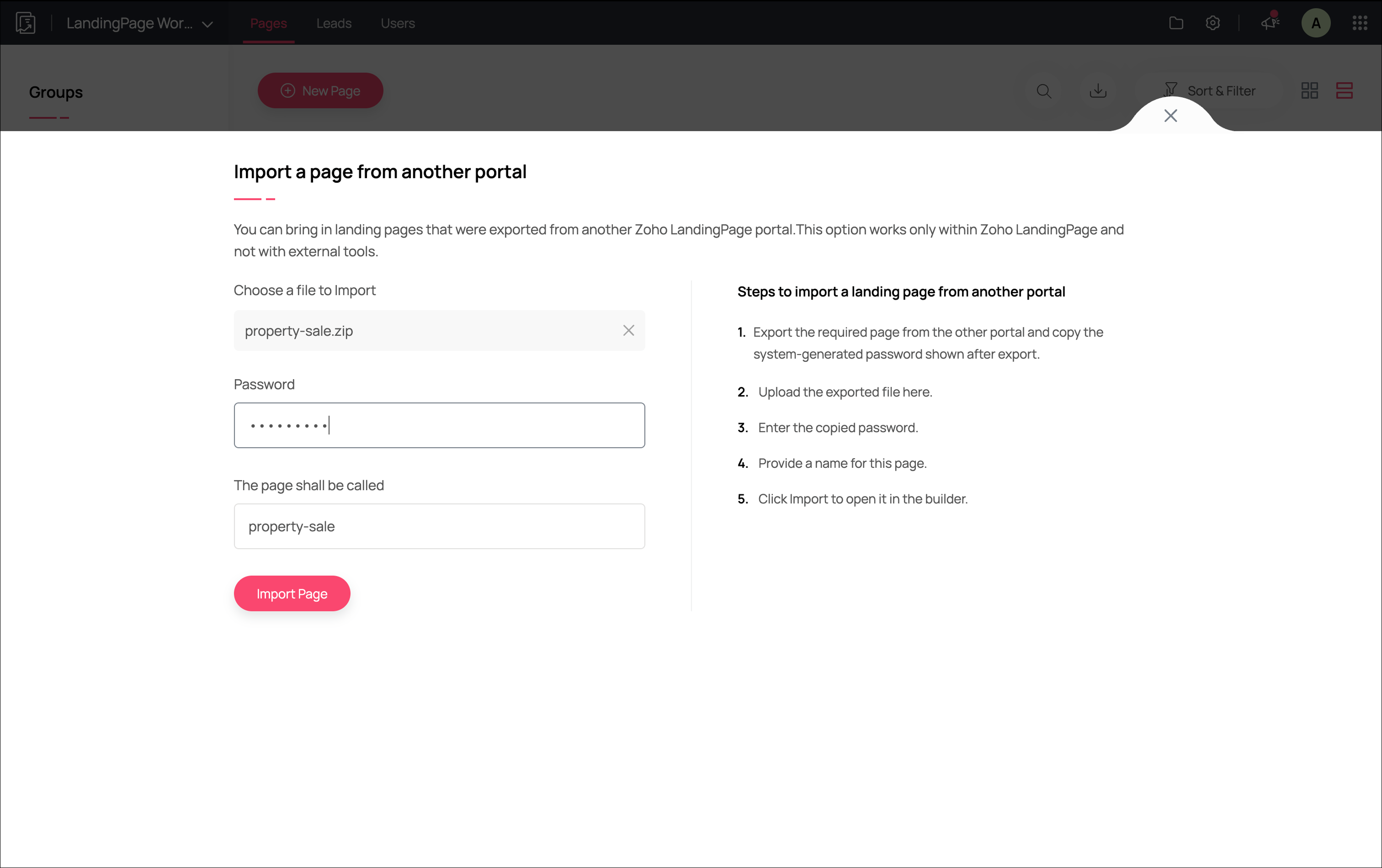 Import and Export Landing Pages | Zoho LandingPage User Guide