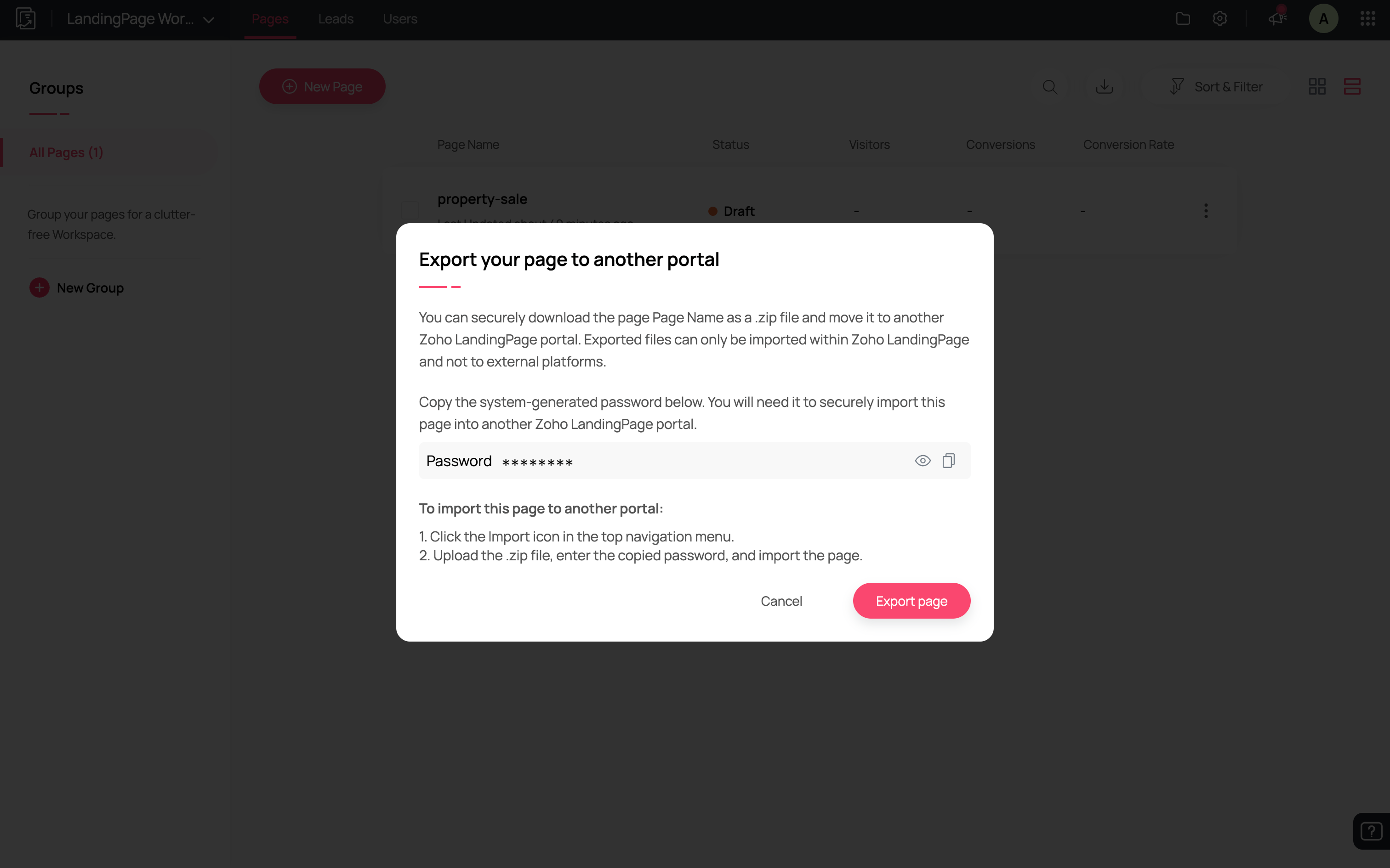 3.  In the landing page export popup, copy the unique password that is displayed for the landing page and click on the Export Page button. The landing page will now be downloaded as a zip file.