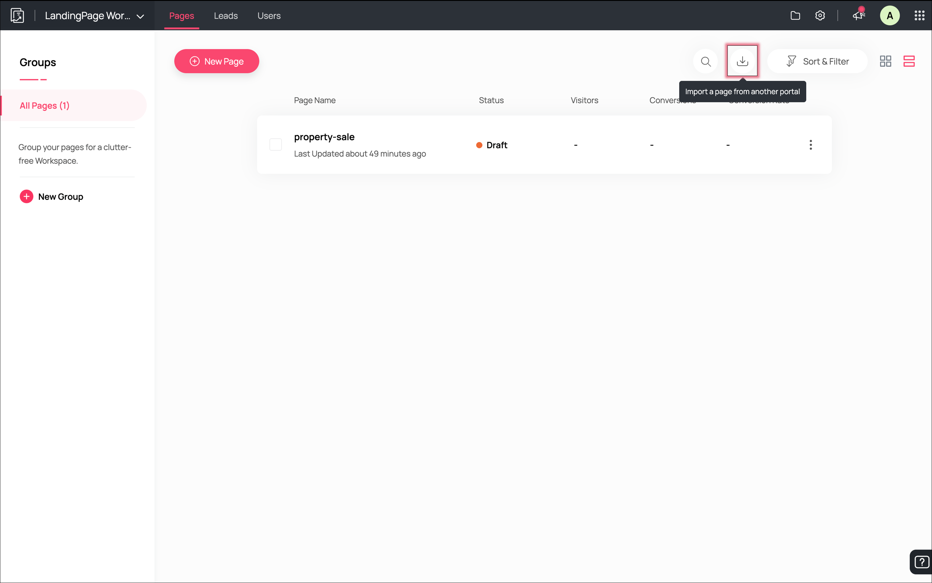 1.  In the landing page workspace where you want the landing page to be imported click on the Import button in the menu above the list of landing pages.