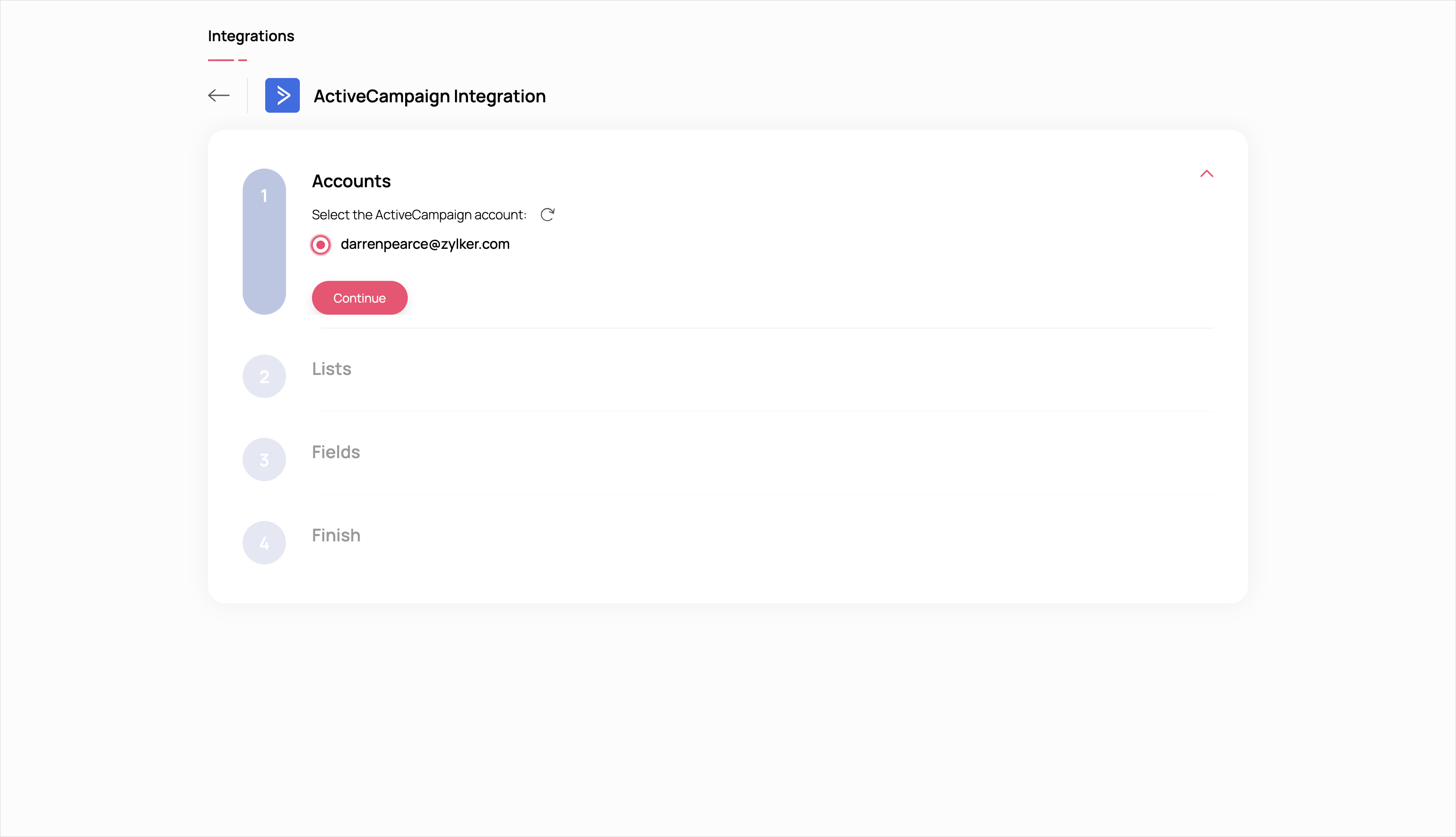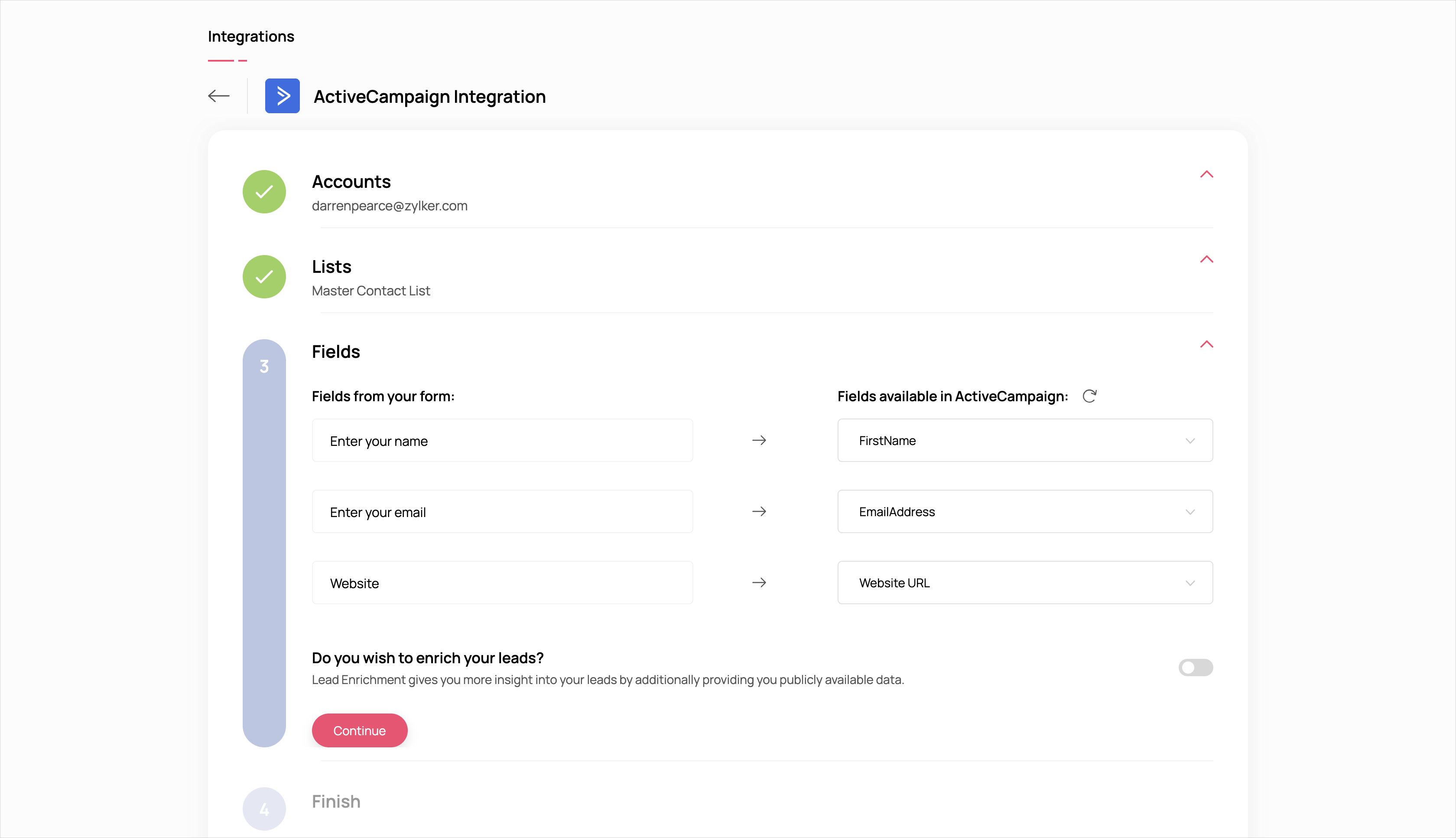 5. Under Fields, map your Page's Fields with their respective ActiveCampaign Fields and click on Continue.