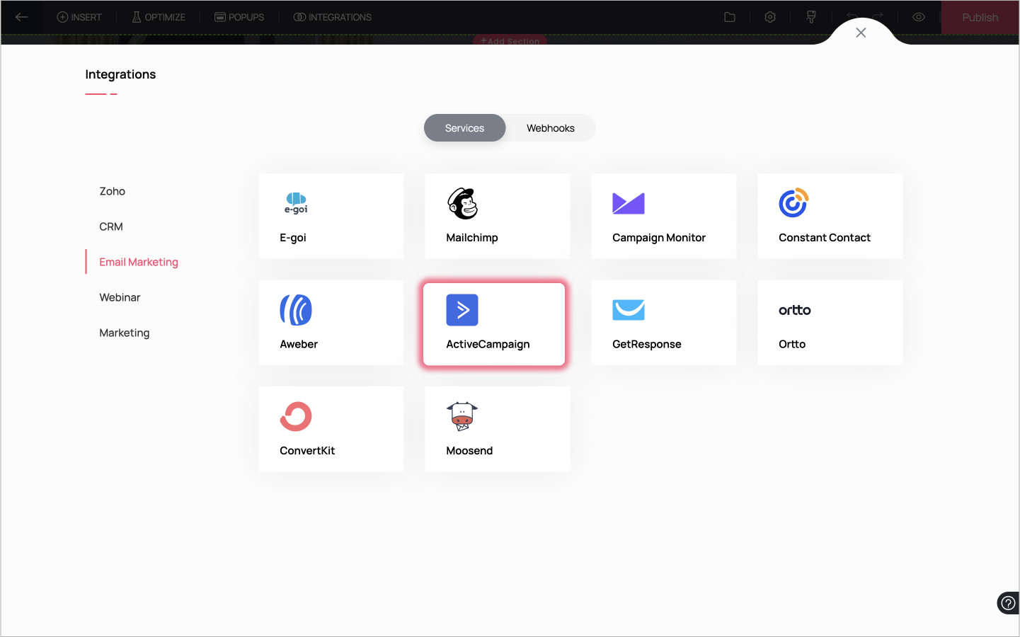 2. Click on Email Marketing and select ActiveCampaign from the list.