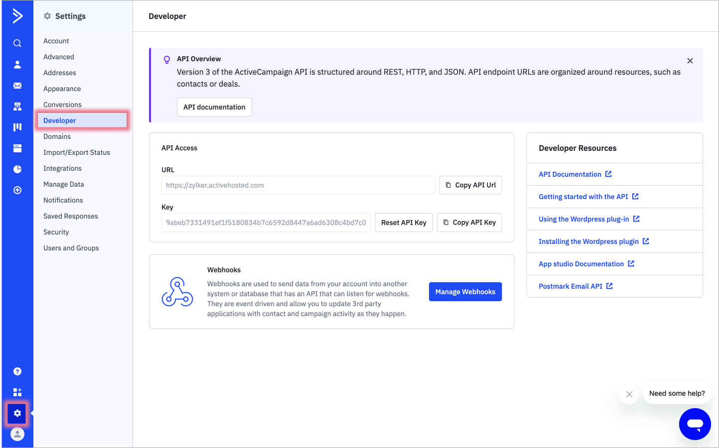 3. Go to your ActiveCampaign account, click on the Settings icon and navigate to Developer to fetch the API URL and Key.