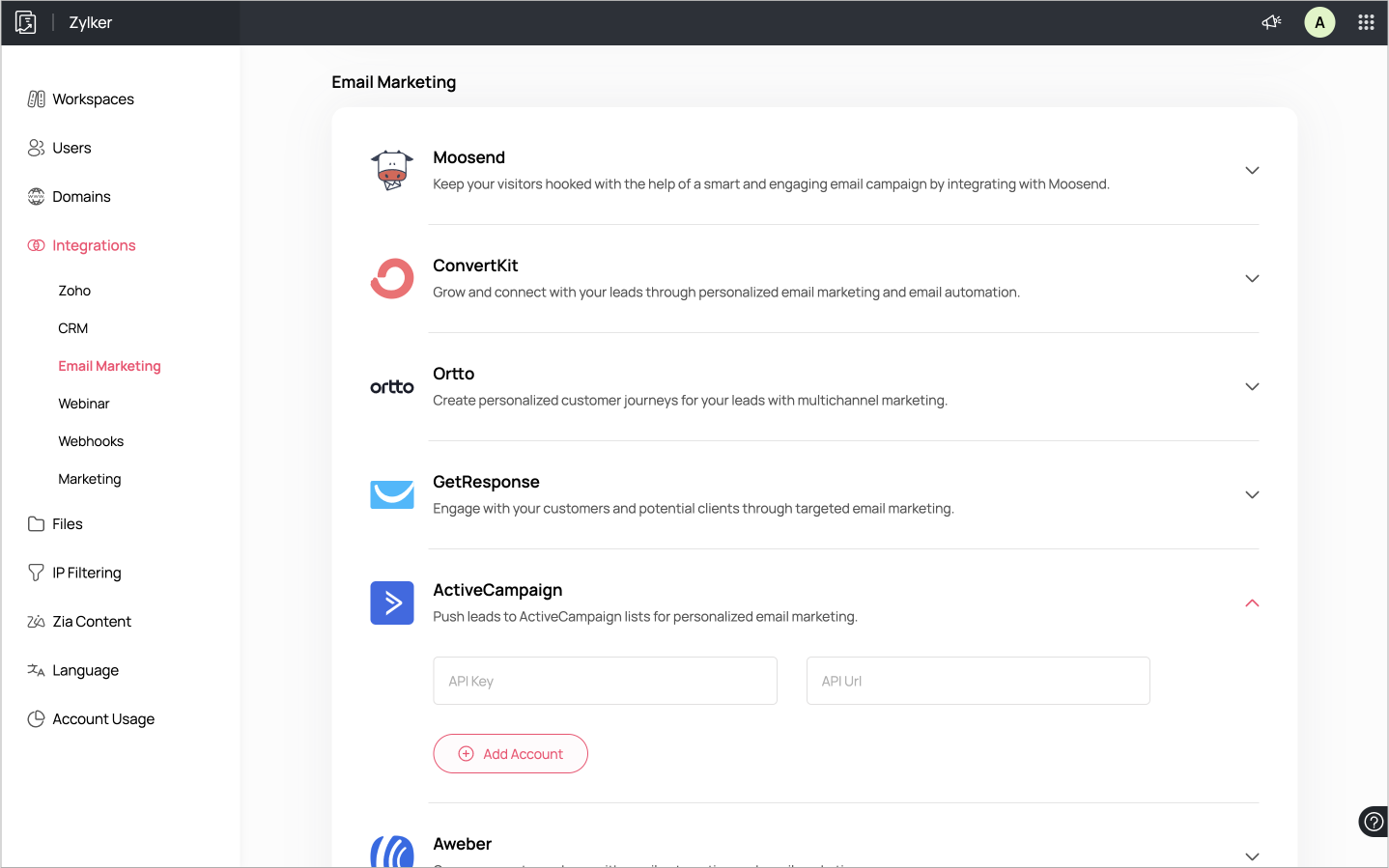 2. Click on Integrations and navigate to Email Marketing from the displayed sub-menu. In the list of integrations displayed, click on ActiveCampaign.