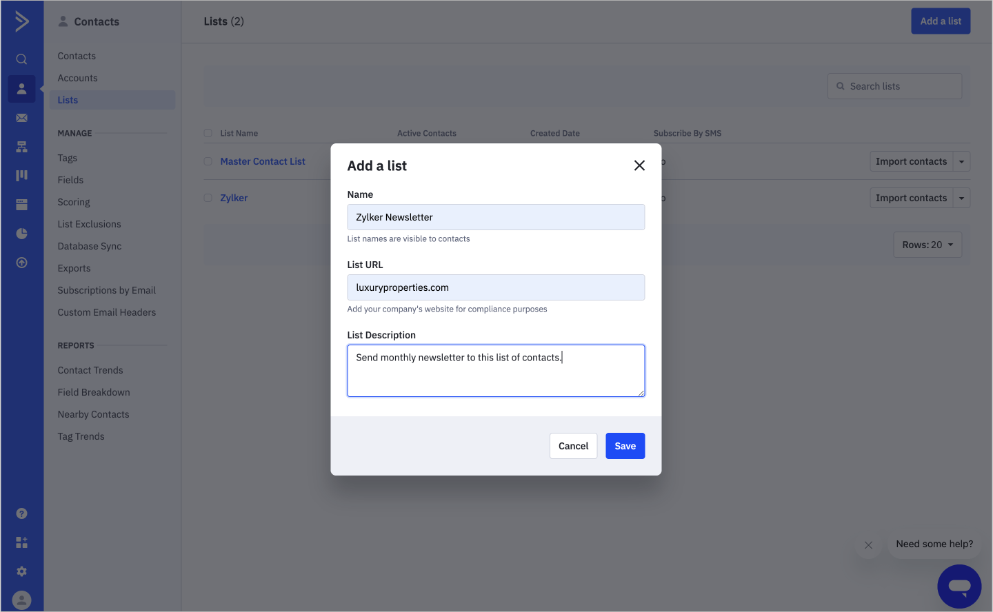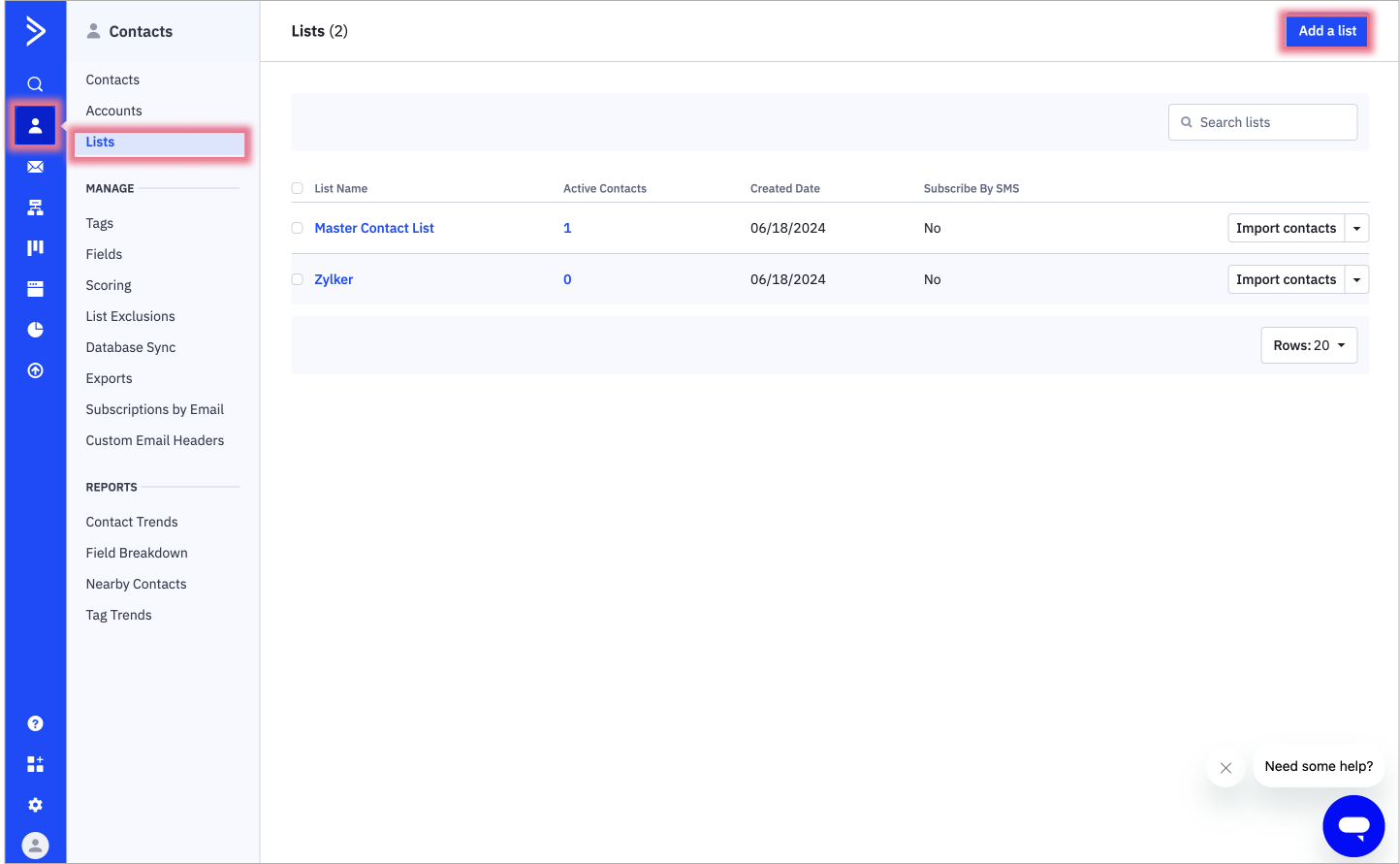 1. In your ActiveCampaign account, create a list by clicking on the Contacts icon and under Lists, click on Add a list.