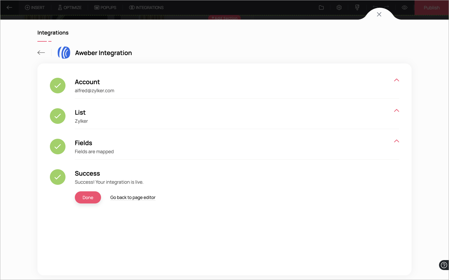 6. Once you have connected your Aweber account with your Zoho LandingPage portal, you can begin to integrate your landing pages with your lists in Aweber.
