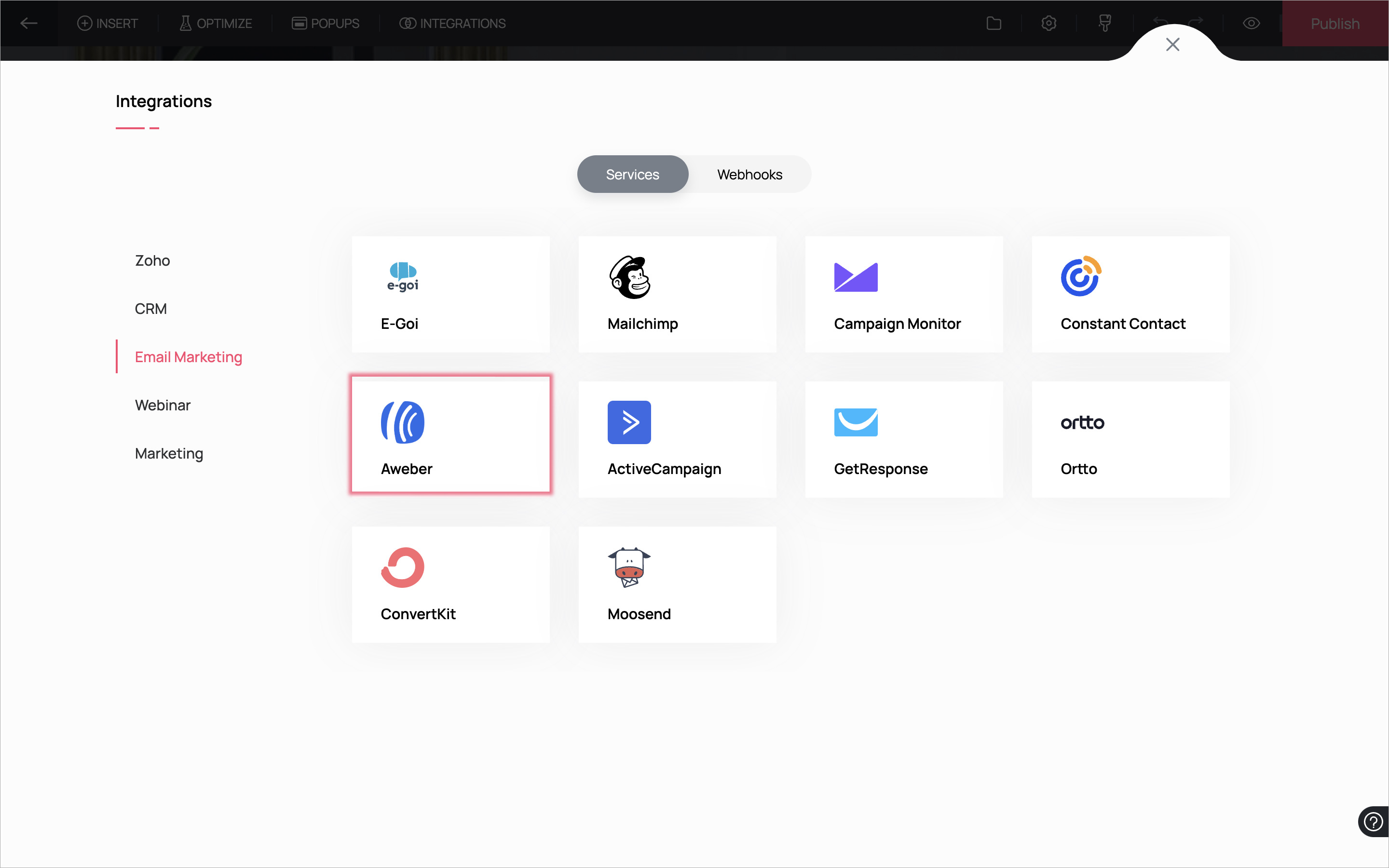 2. In the Integrations window, click on Aweber from the list of Email Marketing integrations.