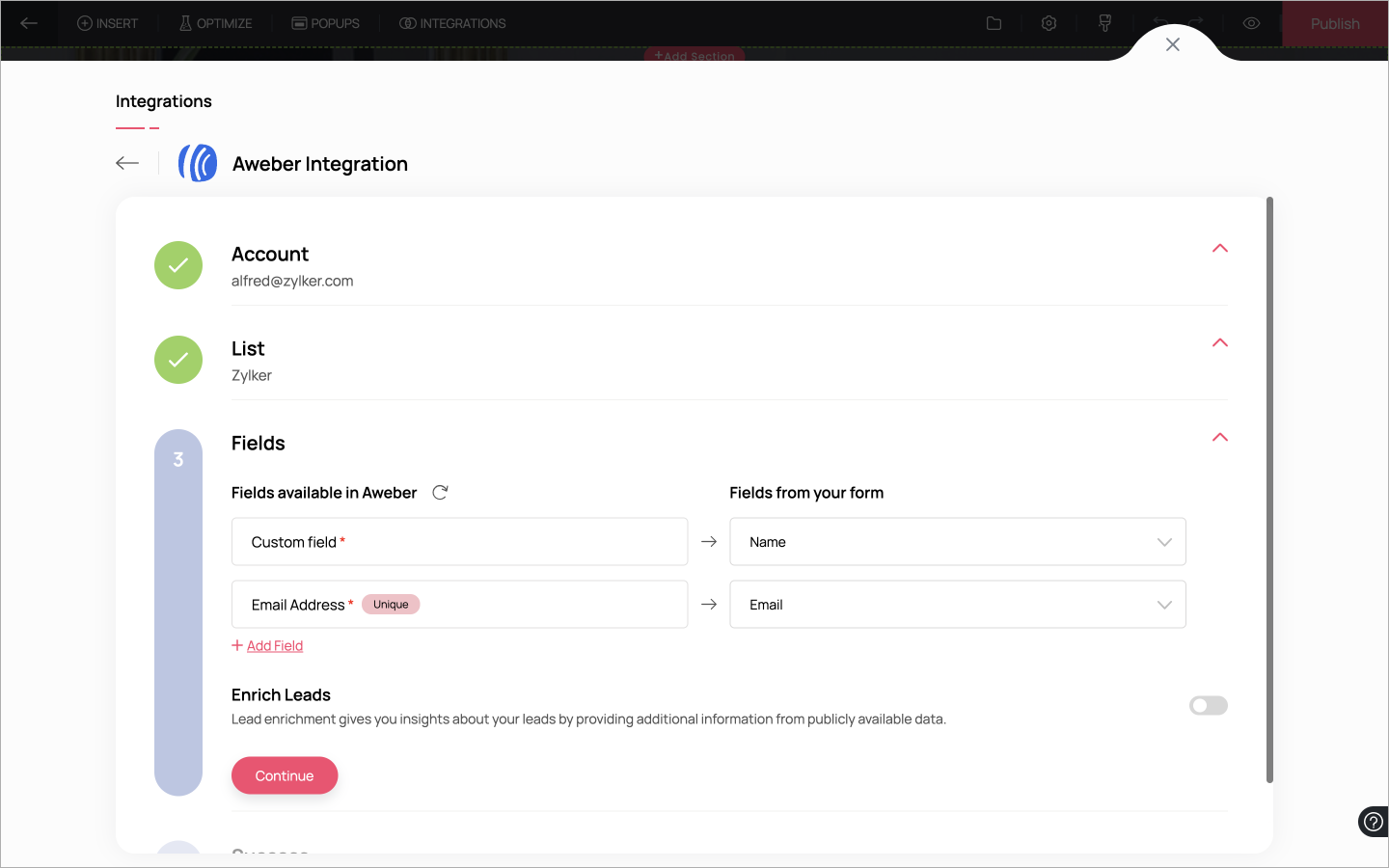 5. Map your landing page form fields to the fields available in Aweber. You also have the option of enriching your leads with publicly available information when you enable lead enrichment. Once you have entered all the details, click on Continue to integrate your landing page with Aweber.