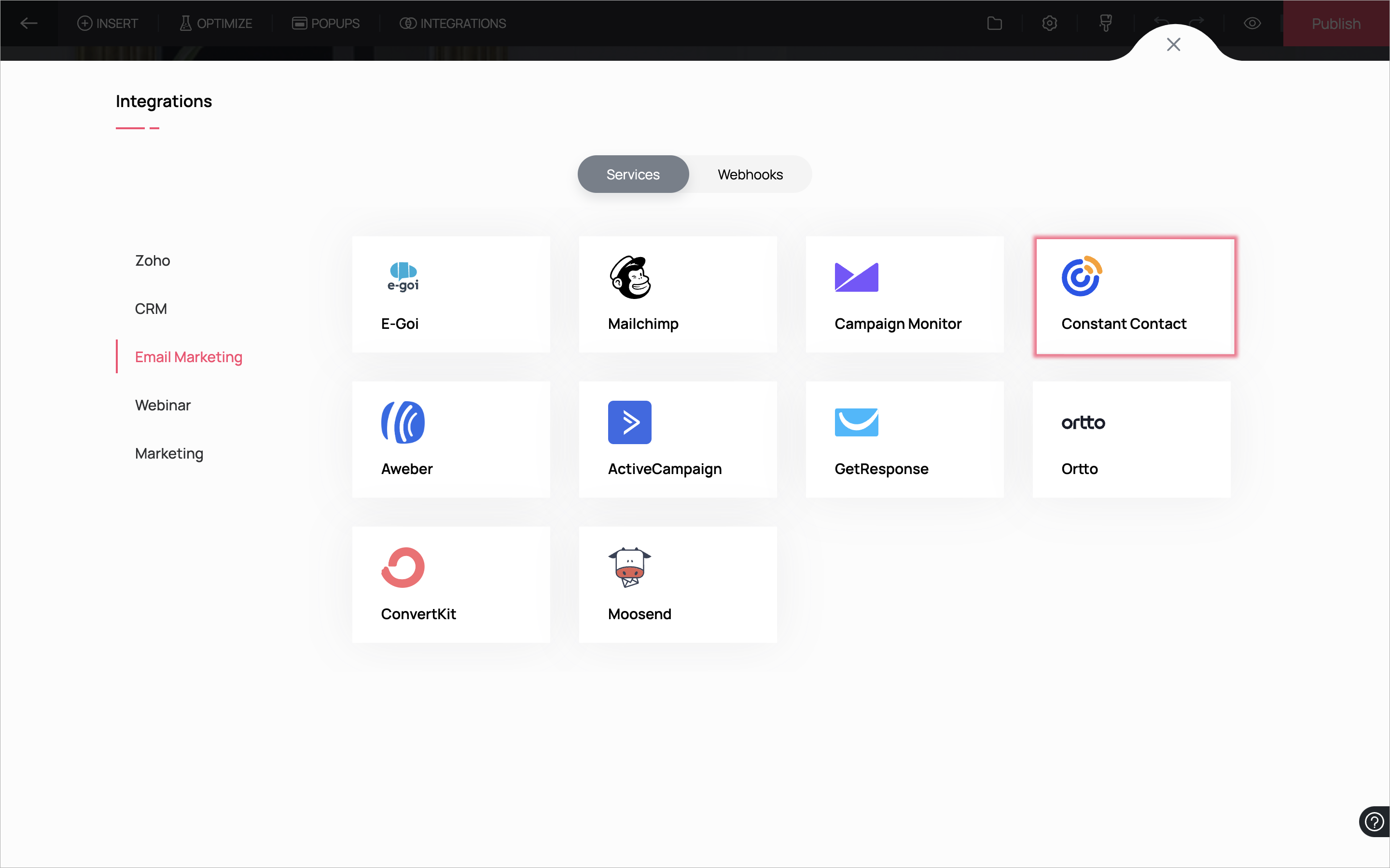 2. In the Integrations window, click on Constant Contact from the list of Email Marketing integrations.