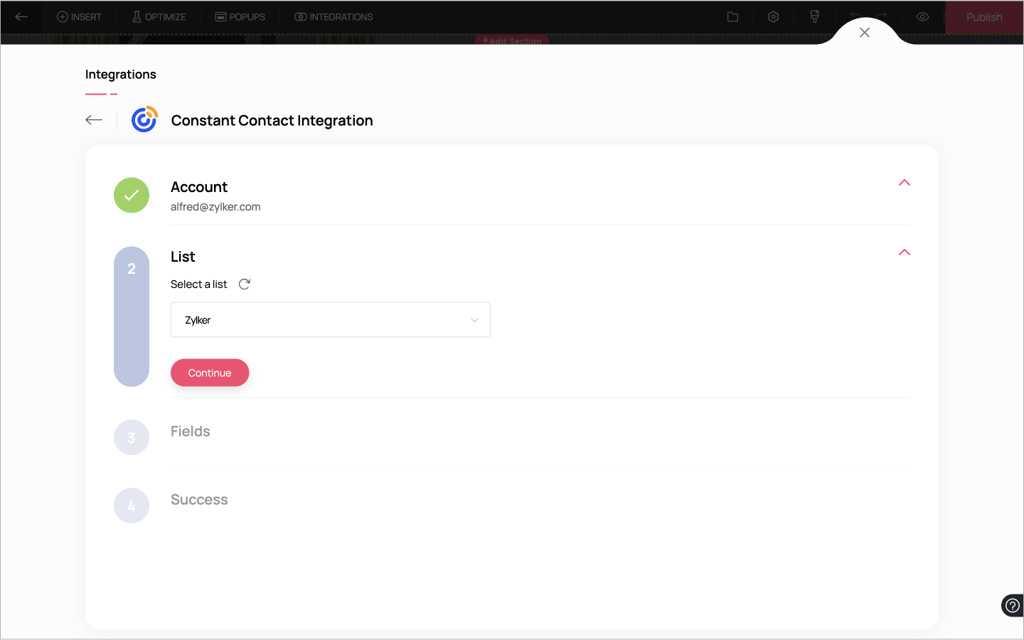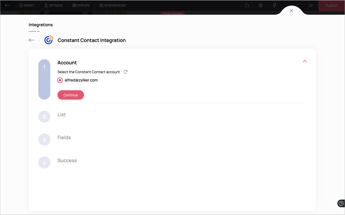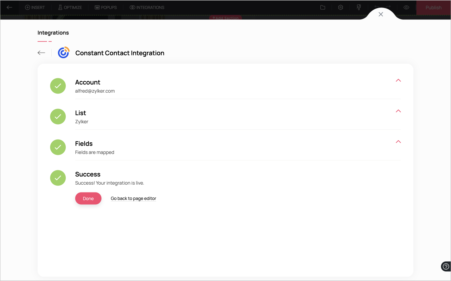 6. Once you have connected your Constant Contact account with your Zoho LandingPage portal, you can begin to integrate your landing pages with your lists in Constant Contact.