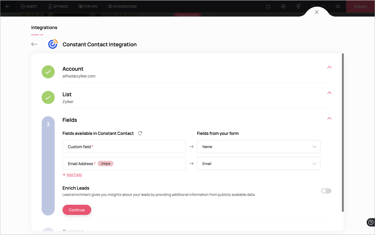 5. Map your landing page form fields to the fields available in Constant Contact. You also have the option of enriching your leads with publicly available information when you enable lead enrichment. Once you have entered all the details, click on Continue to integrate your landing page with Constant Contact.