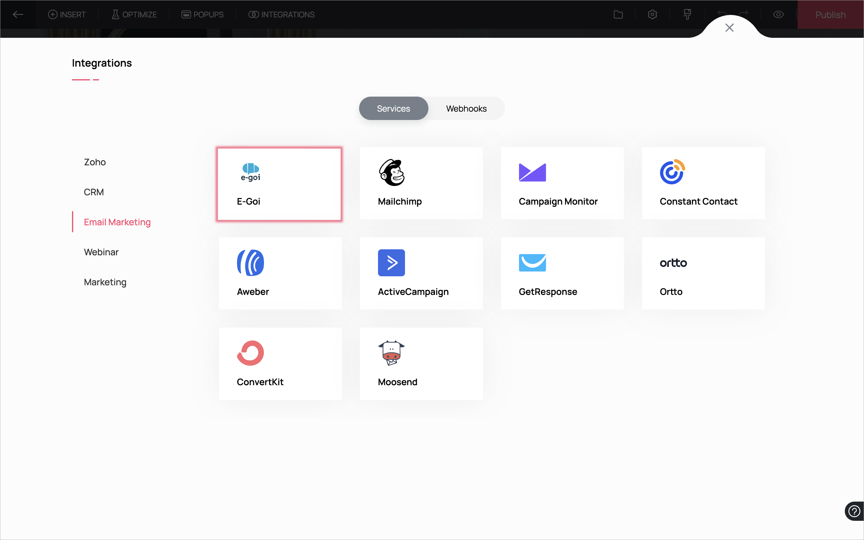 2. In the Integrations window, click on E-goi from the list of Email Marketing integrations.