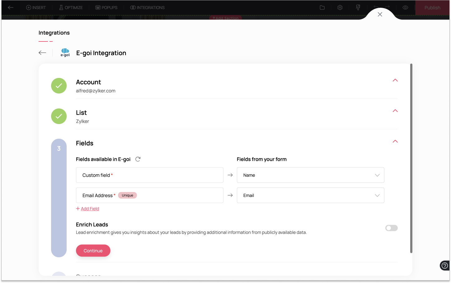 5. Map your landing page form fields to the fields available in E-goi. You also have the option of enriching your leads with publicly available information when you enable lead enrichment. Once you have entered all the details, click on Continue to integrate your landing page with E-goi.
