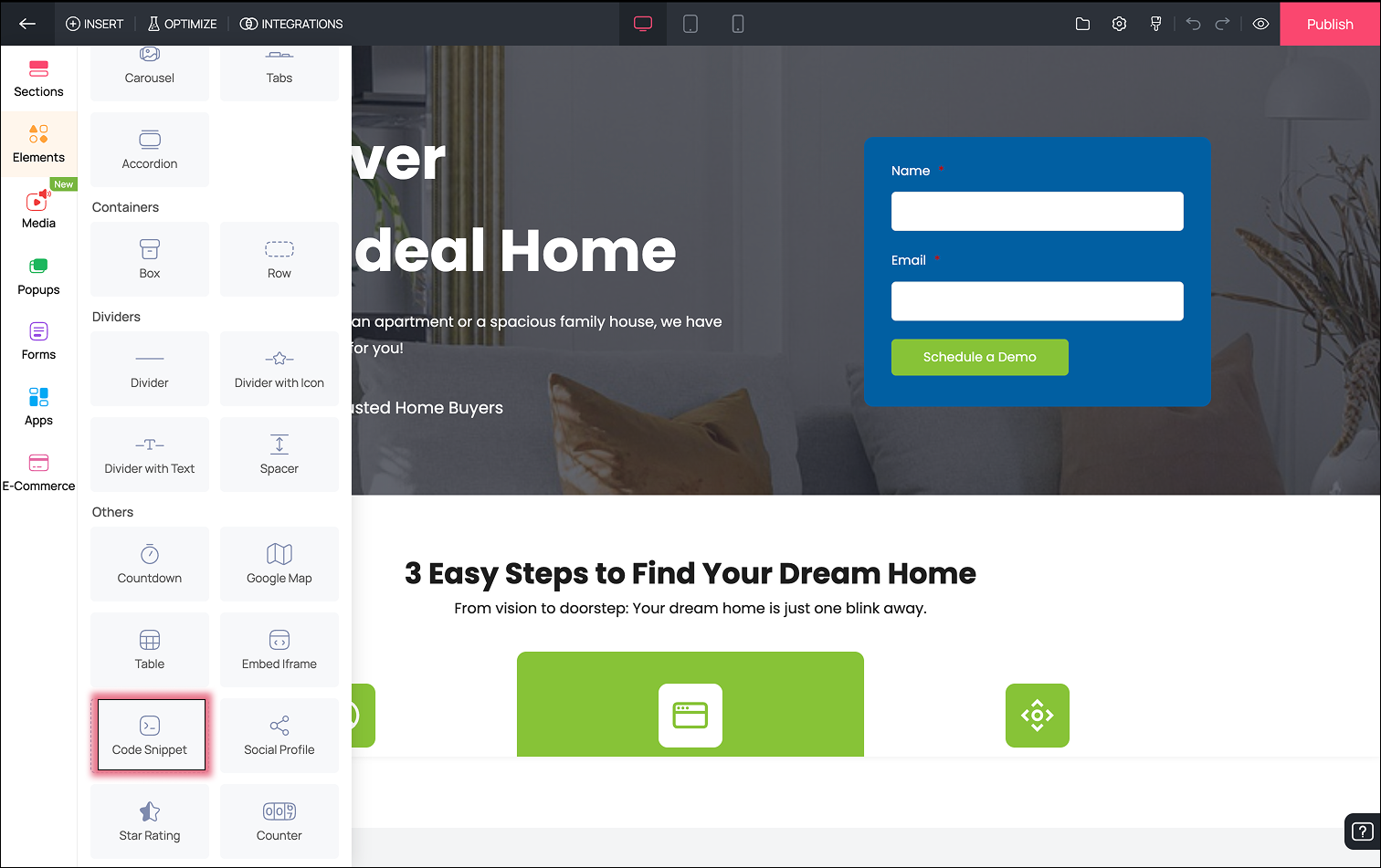 2.   In the menu, click on the Elements tab and choose the Code Snippet element to be inserted in your landing page.
