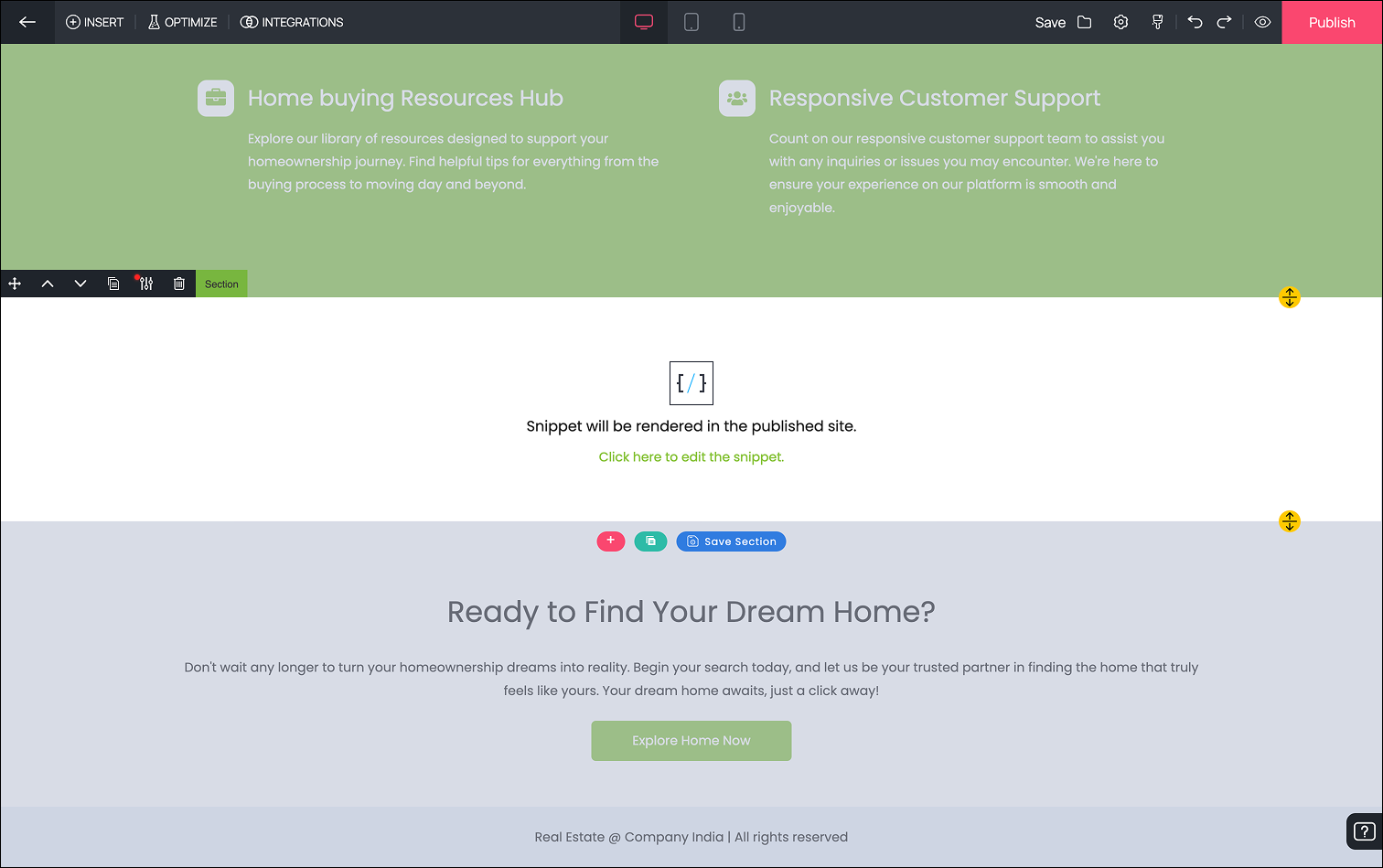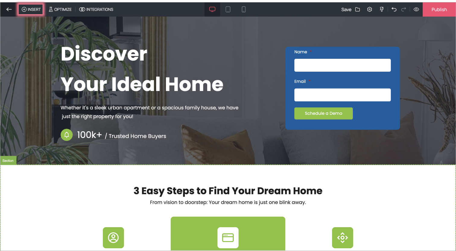 1. To insert a Zoho SalesIQ widget to your landing page, click on the Insert button to view the menu.