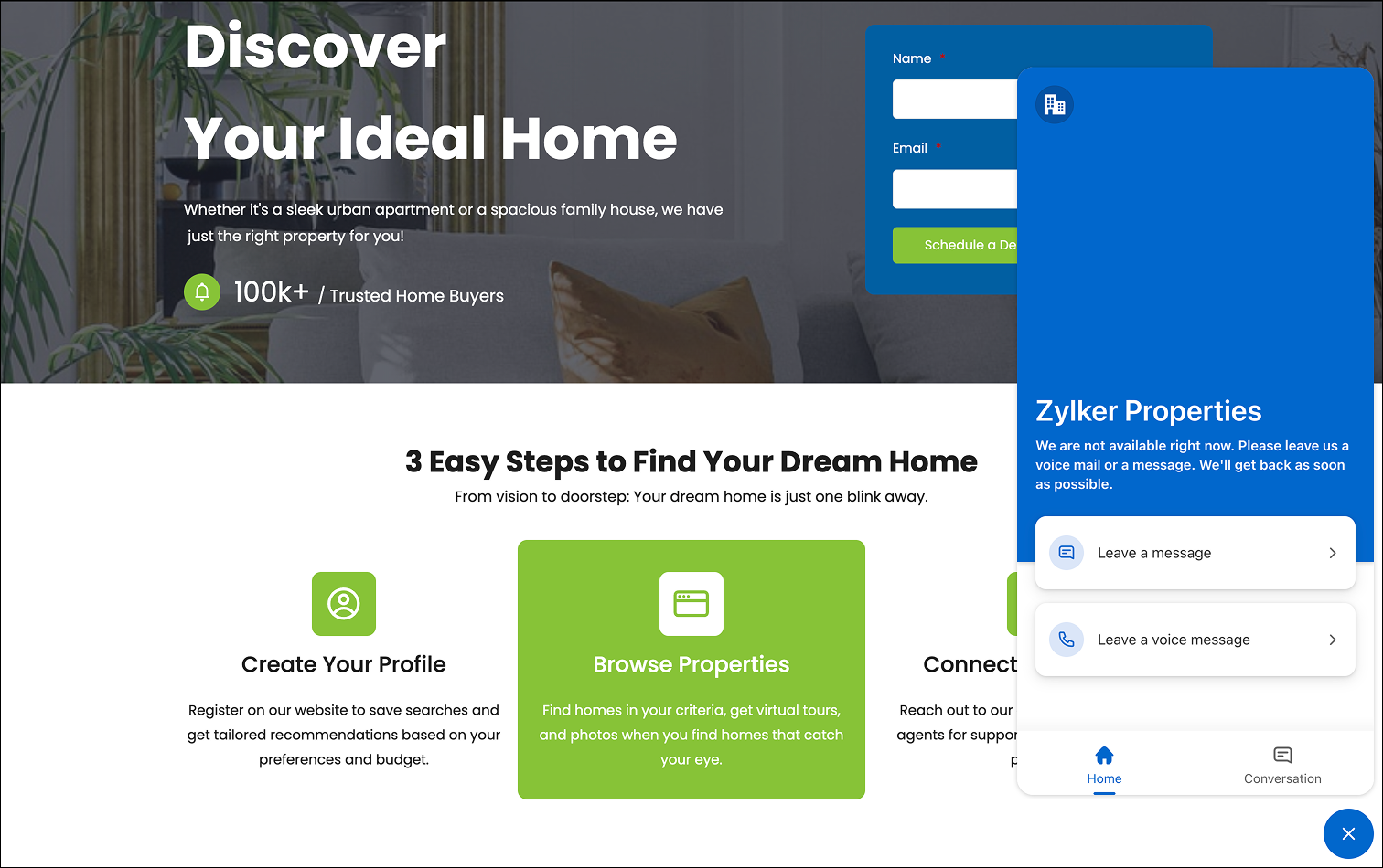 With Zoho SalesIQ, you can add a chatbot or a live chat widget to your landing page. This can help engage with your visitors in real time and provide personalized solutions to their queries.
