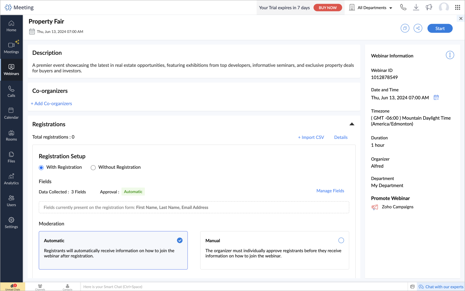 3.  Once you have scheduled the webinar, you will be able to view the details of the webinar in the Webinars tab. This is where you will be able to view the registrations from the landing page once you have integrated Zoho Meeting with Zoho LandingPage.