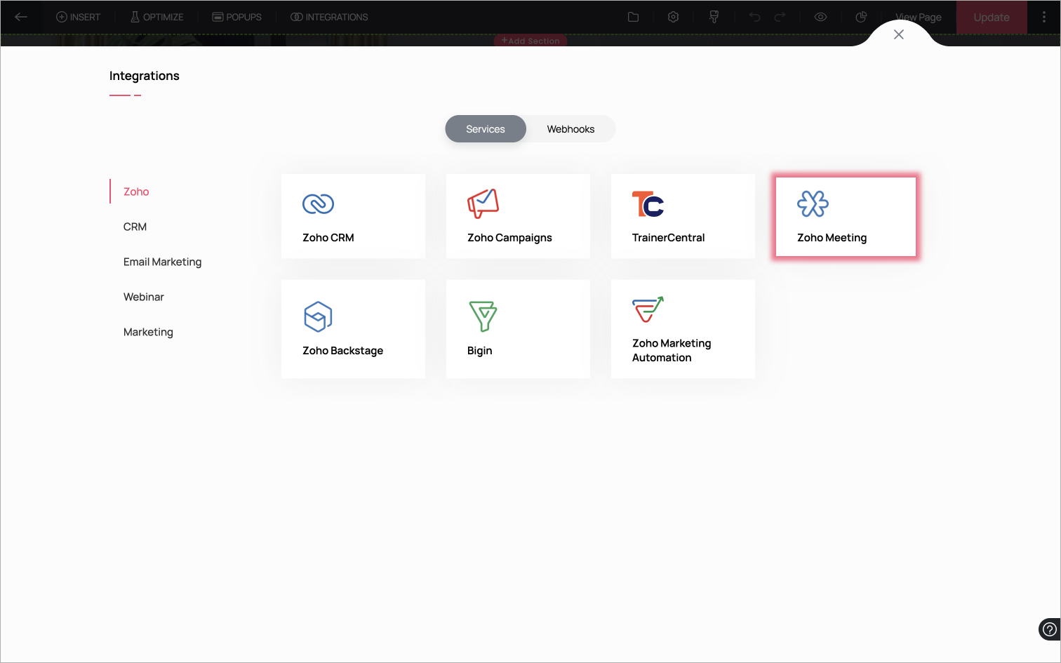 2.   In the Integrations window, select Zoho from the categories displayed and choose Zoho Meeting from the list of integrations.