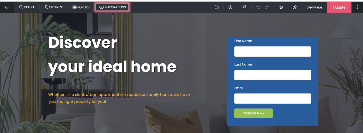 1. In your landing page builder, click on Integrations on the top bar to view and manage the integrations for the landing page.