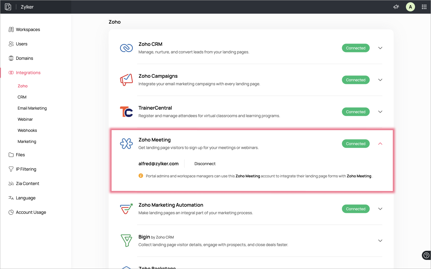 Only portal owners and portal admins can setup an integration in your Zoho LandingPage account. Portal owners, portal admins, and workspace managers can connect, pause, and disconnect integrations with the landing pages in their portal/ workspace.
