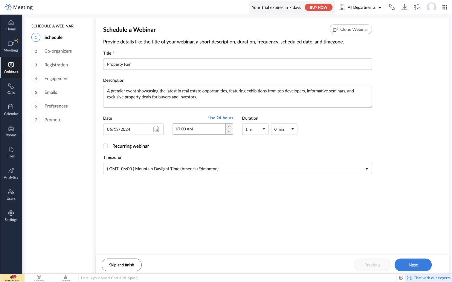 2. Enter the webinar title, description, date, and timings to schedule the webinar.  You can also add details such as co-organizers, registration and engagement preferences before you click on the finish button.