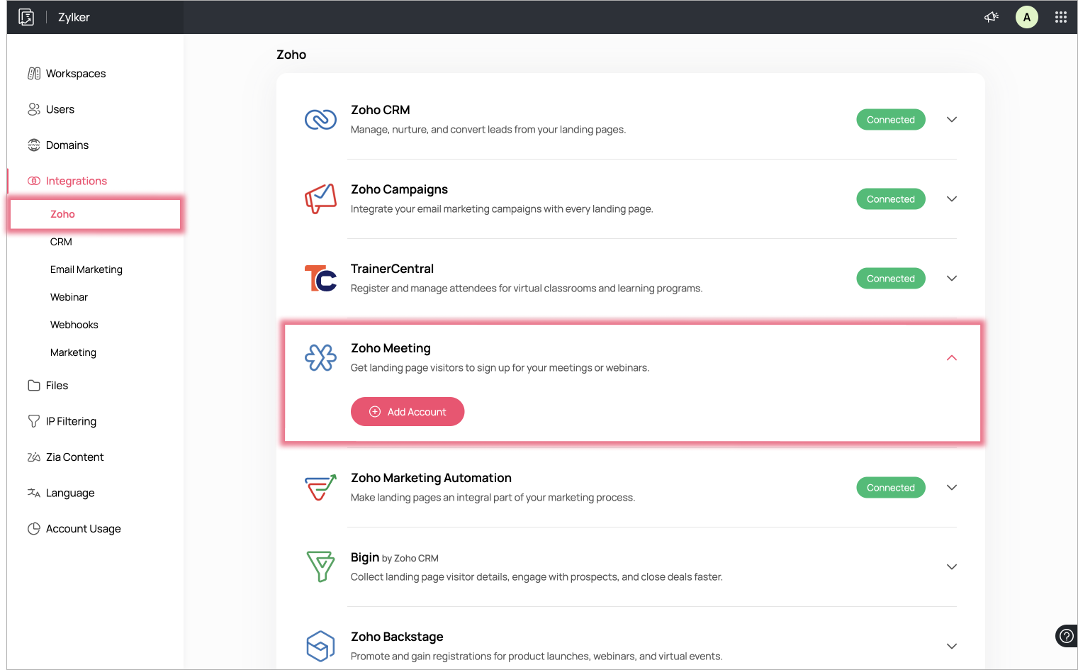 2.  Select the Integrations tab and click on Zoho from the displayed sub-menu. In the list of integrations displayed now, choose Zoho Meeting and click on the Add Account button to integrate your Zoho Meeting account with your Zoho LandingPage portal.