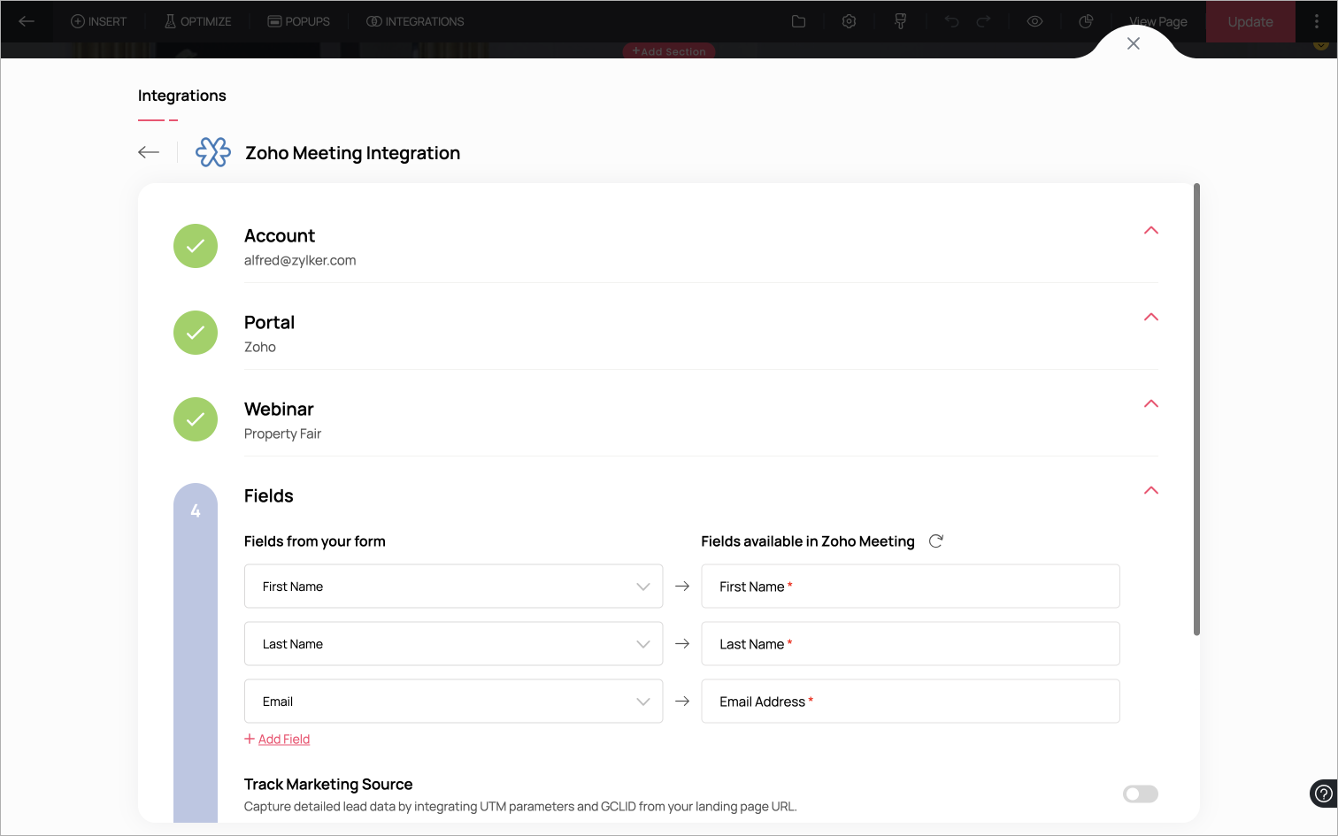 3.  In the integration popup window, select your account, portal, and webinar. Map your landing page form fields to the fields available in Zoho Meeting. Once you have entered all the details, click on Continue to integrate your landing page with Zoho Meeting.