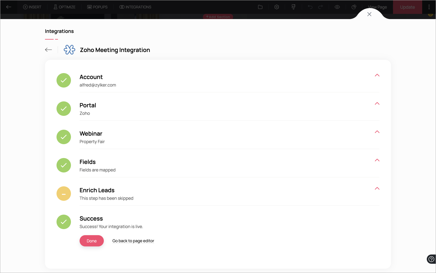 4.  You have now successfully integrated your landing page with Zoho Meeting. Registrations from your landing page forms will be automatically pushed to your webinar dashboard in Zoho Meeting.