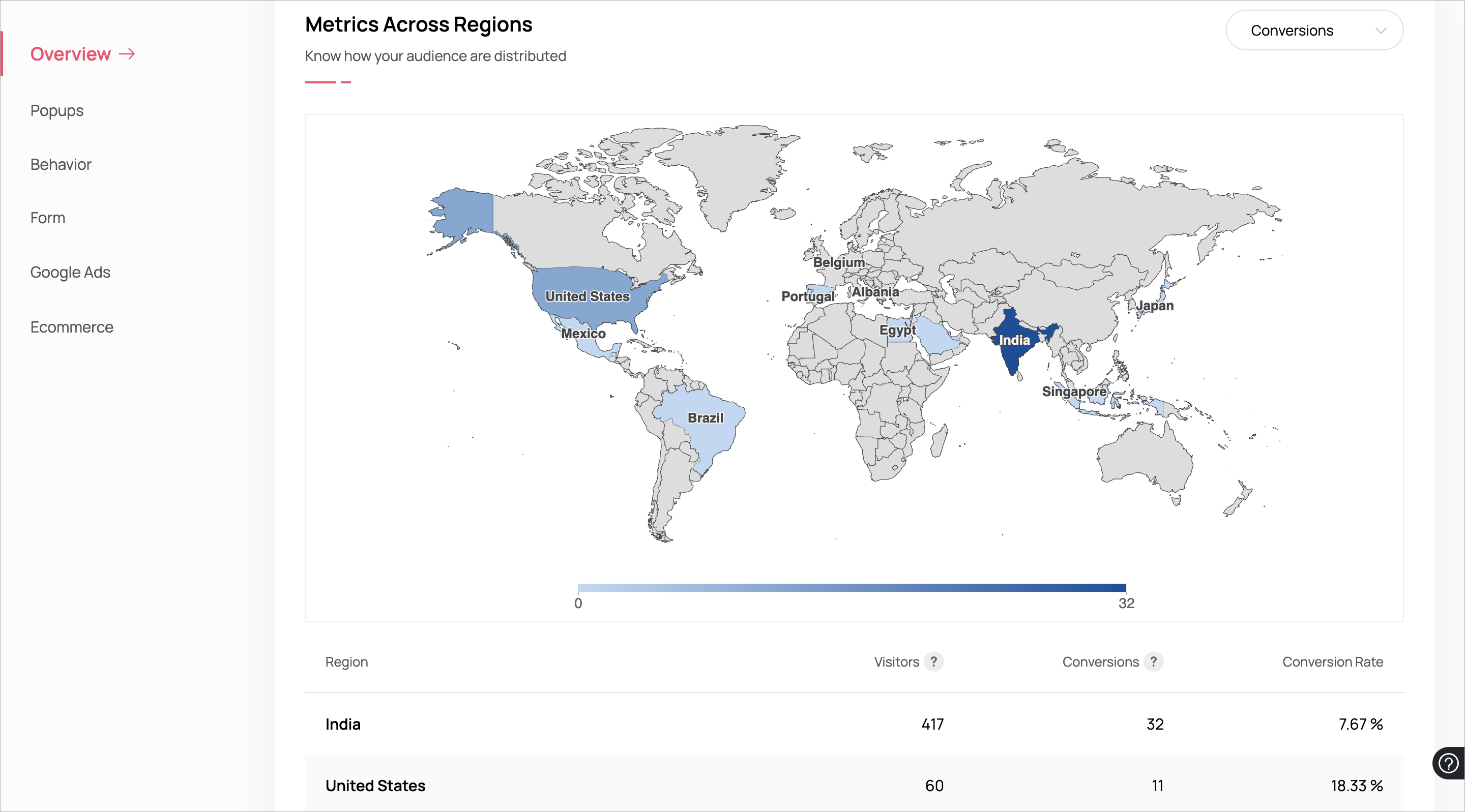 1. Gain insights into the geographic distribution of your audience with the Metrics Across Regions section.