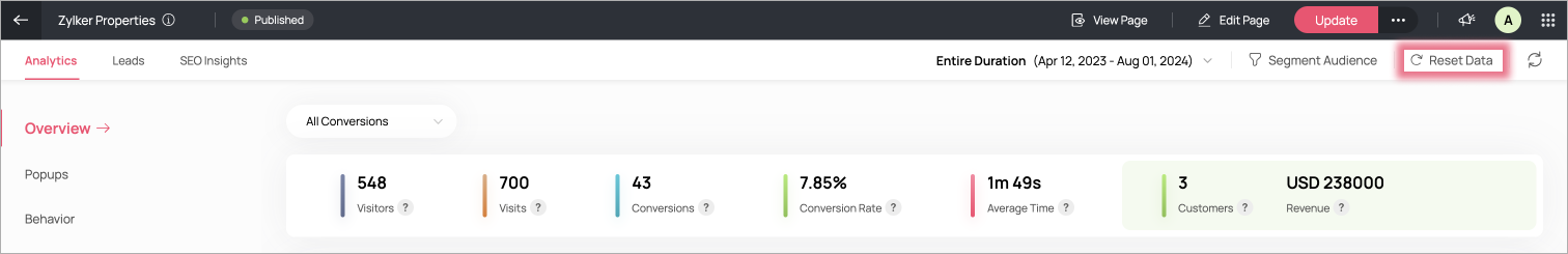 The Reset Data option is valuable when you need to start tracking data from scratch on your landing pages. This is particularly useful in scenarios where the existing data has become outdated, irrelevant, or if there has been a significant change in your content, marketing strategy, or audience. By resetting the data, you can ensure that all new statistics, analytics, and leads are accurately recorded from the moment of reset, without any influence from past data. This is especially beneficial for businesses that want to test and gauge the impact of new campaigns or changes to their landing pages without the clutter of old data