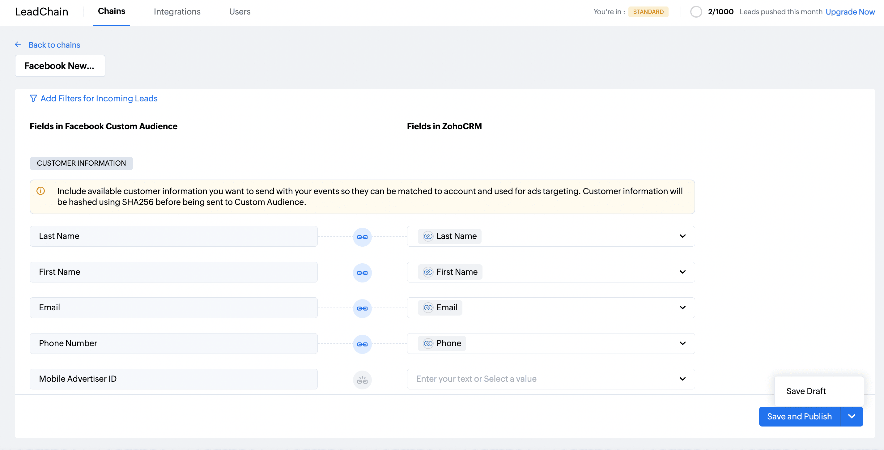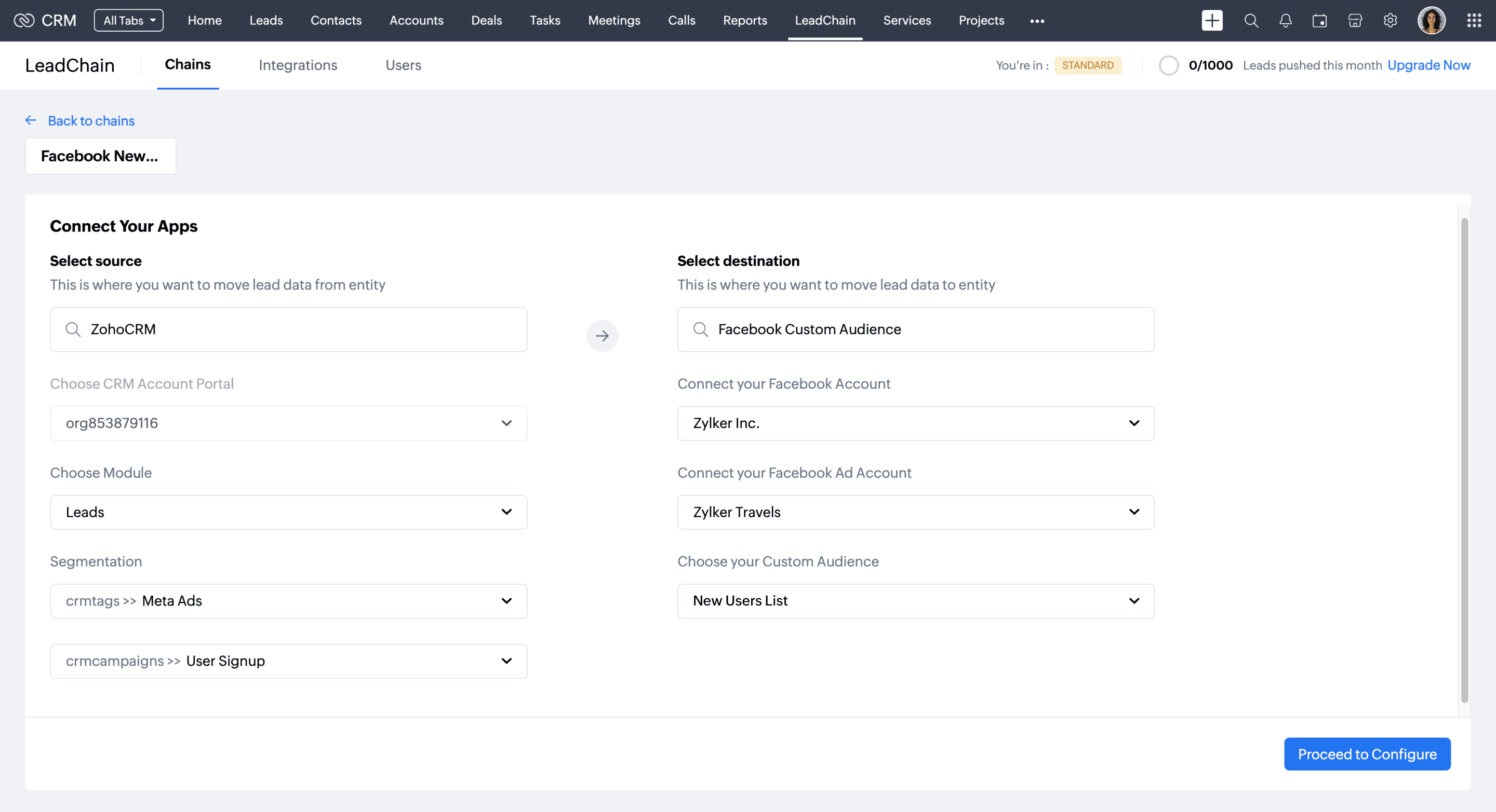 With LeadChain, you'll be able to connect your Zoho CRM with Facebook, and send all the lead conversion events directly to the Facebook custom audience tool and make relevant changes to the audience set wherever necessary.