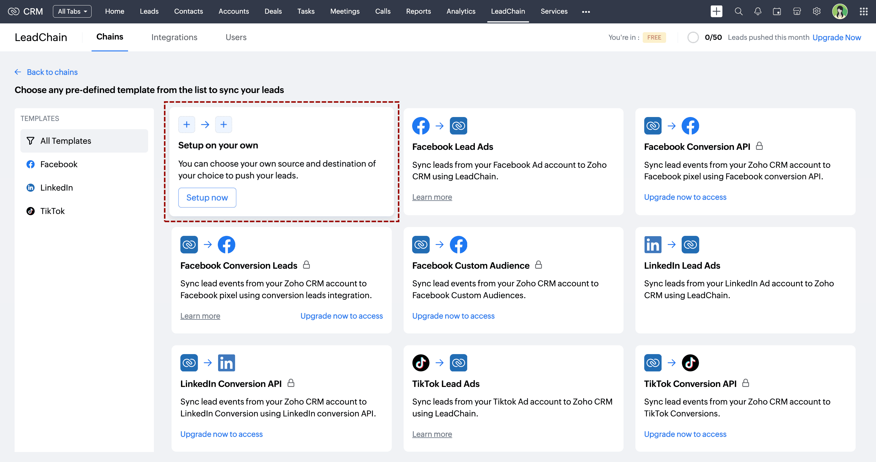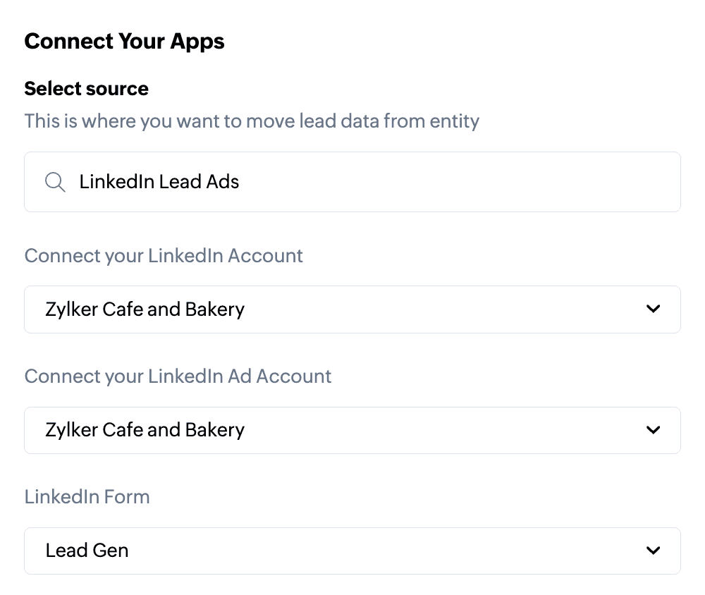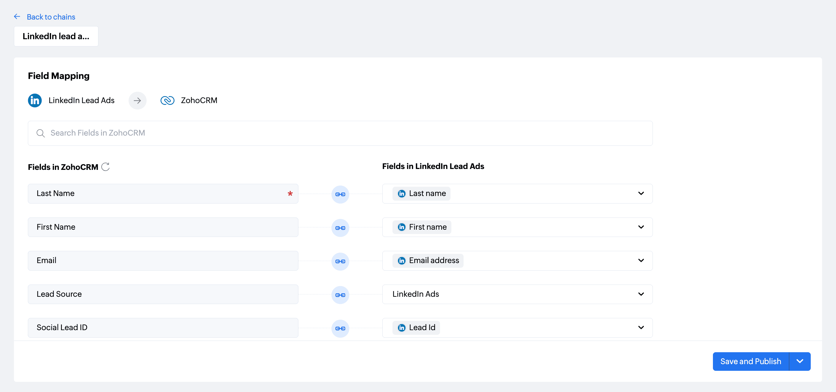 Zoho LeadChain lets you connect your LinkedIn Lead Ads and Zoho CRM and synchronize the leads automatically to the Leads/Contacts module. It involves the following steps.