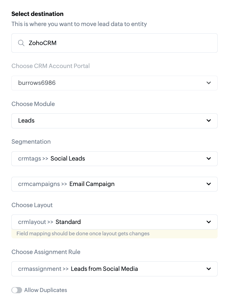 Choose the CRM Layout A layout in Zoho CRM houses all the fields where information about the leads can be stored. Multiple layouts can be created and managed in Zoho CRM to capture the right set of data that's required for the processes involved in your business. Choosing the right CRM layout here helps ensure all the desired information about the leads that are generated from LinkedIn Lead Ads are synchronized seamlessly. The field mapping that's involved in Step 2, completely depends on the layout that's chosen here.