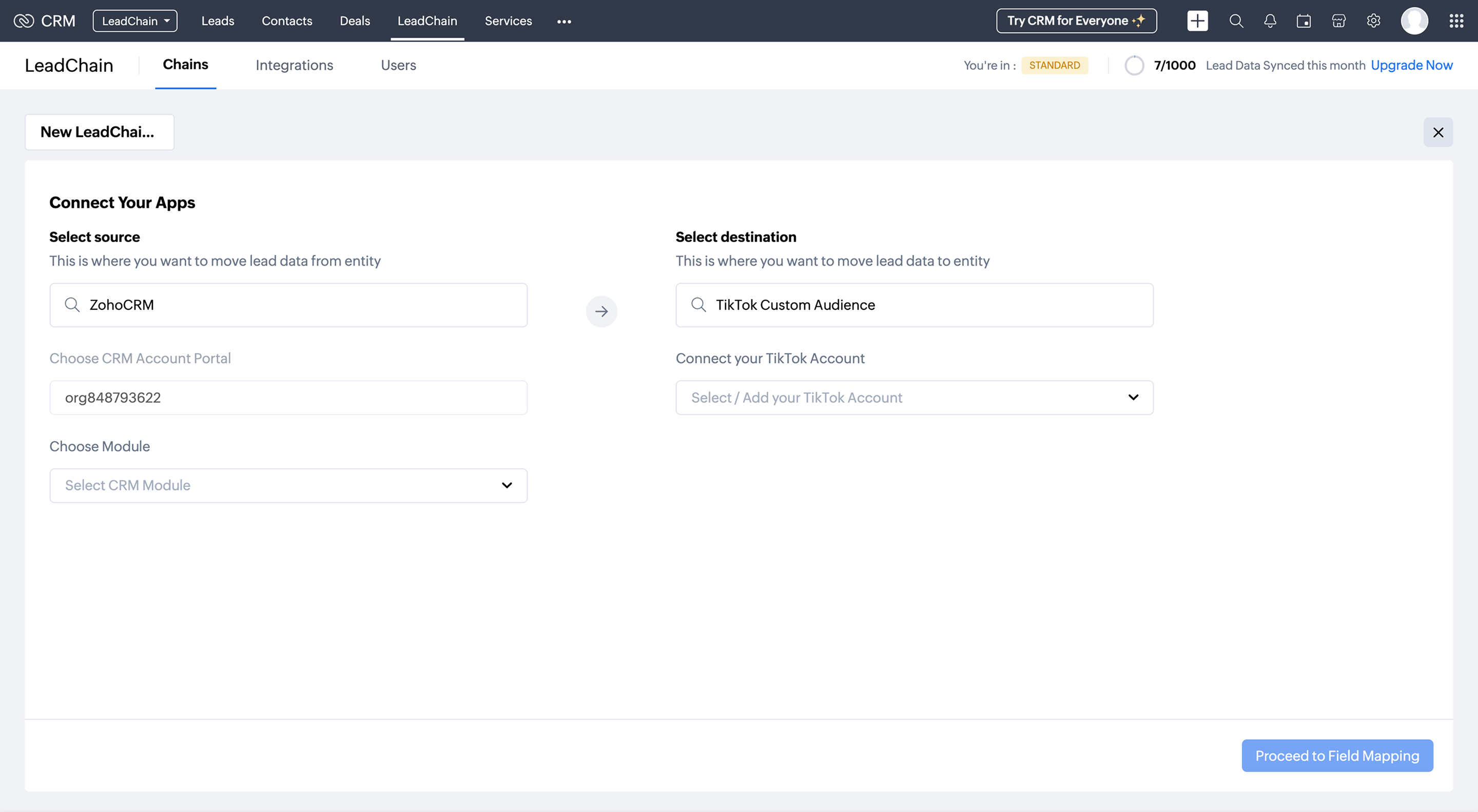 With LeadChain, you can seamlessly connect Zoho CRM with TikTok. This integration sends all your lead conversion events directly to TikTok’s Custom Audience tool, so you can refine or adjust your audience sets as needed and maximize campaign performance.