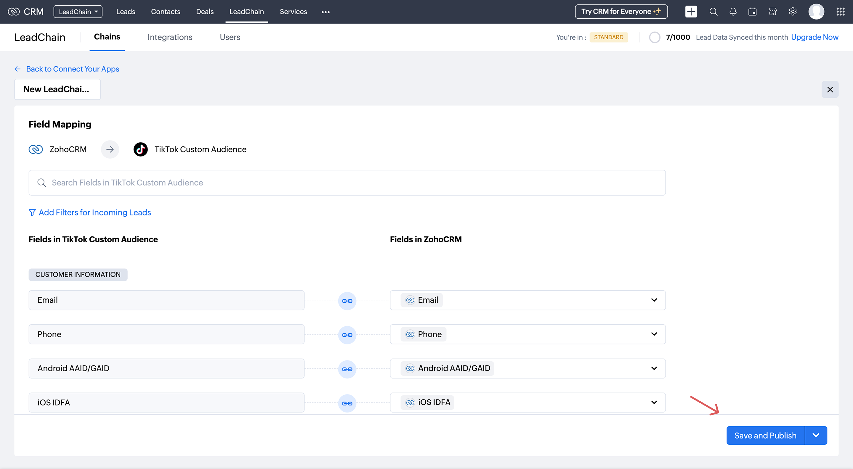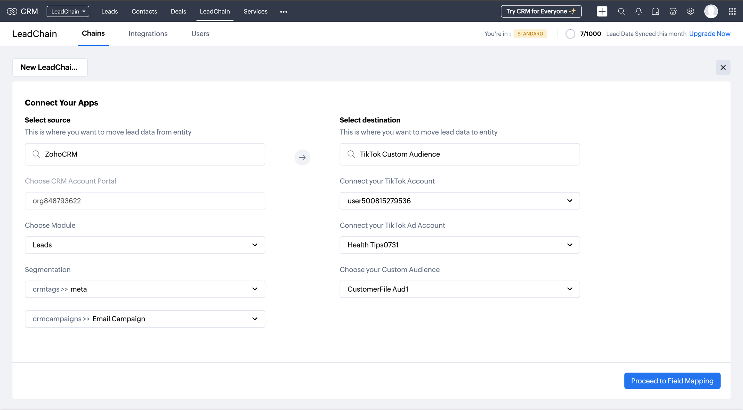 To establish a chain between Zoho CRM and Tiktok Custom Audience