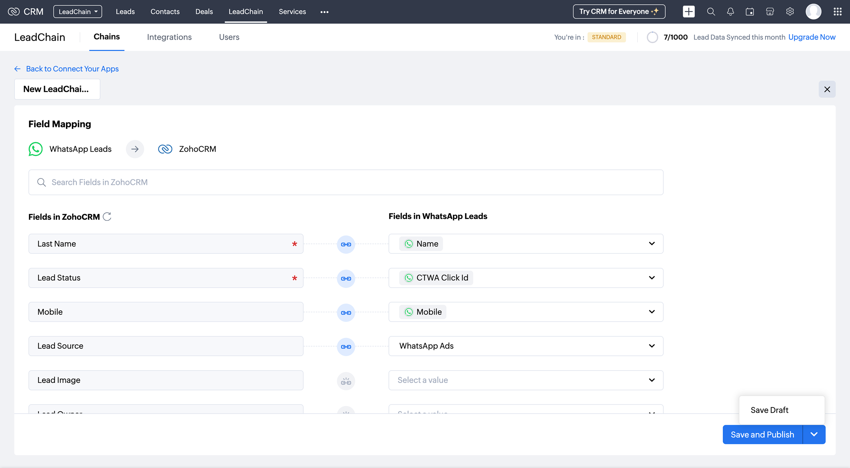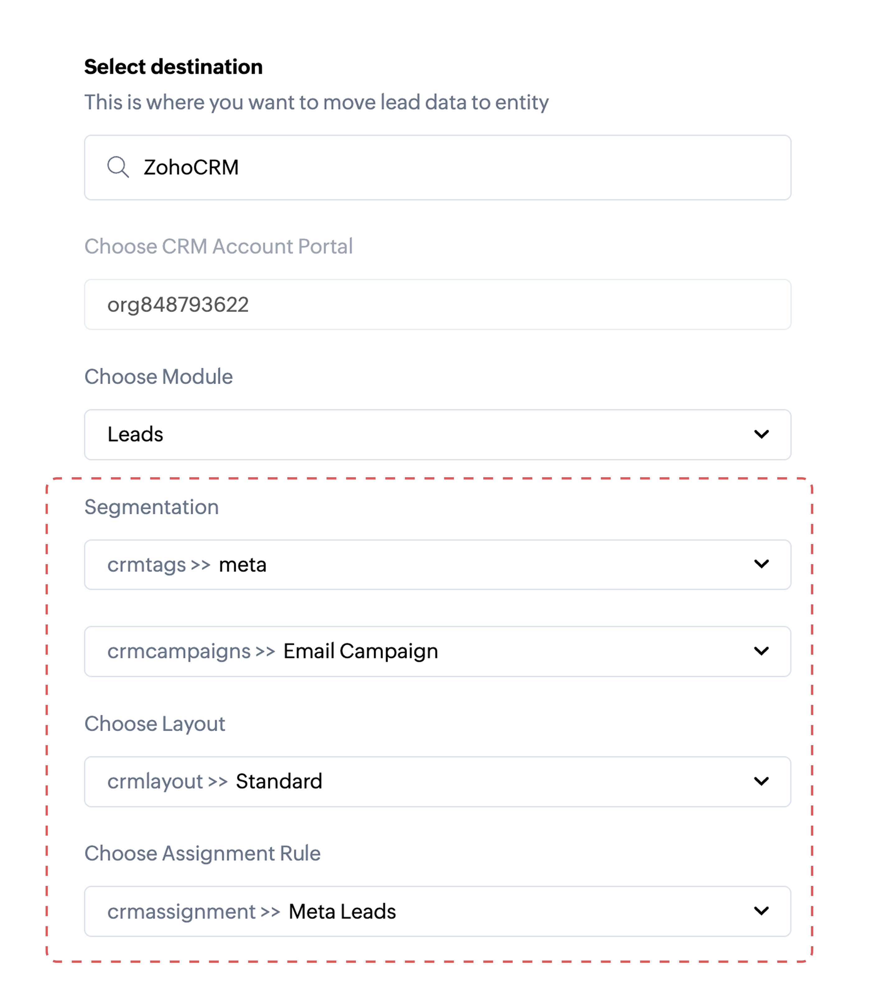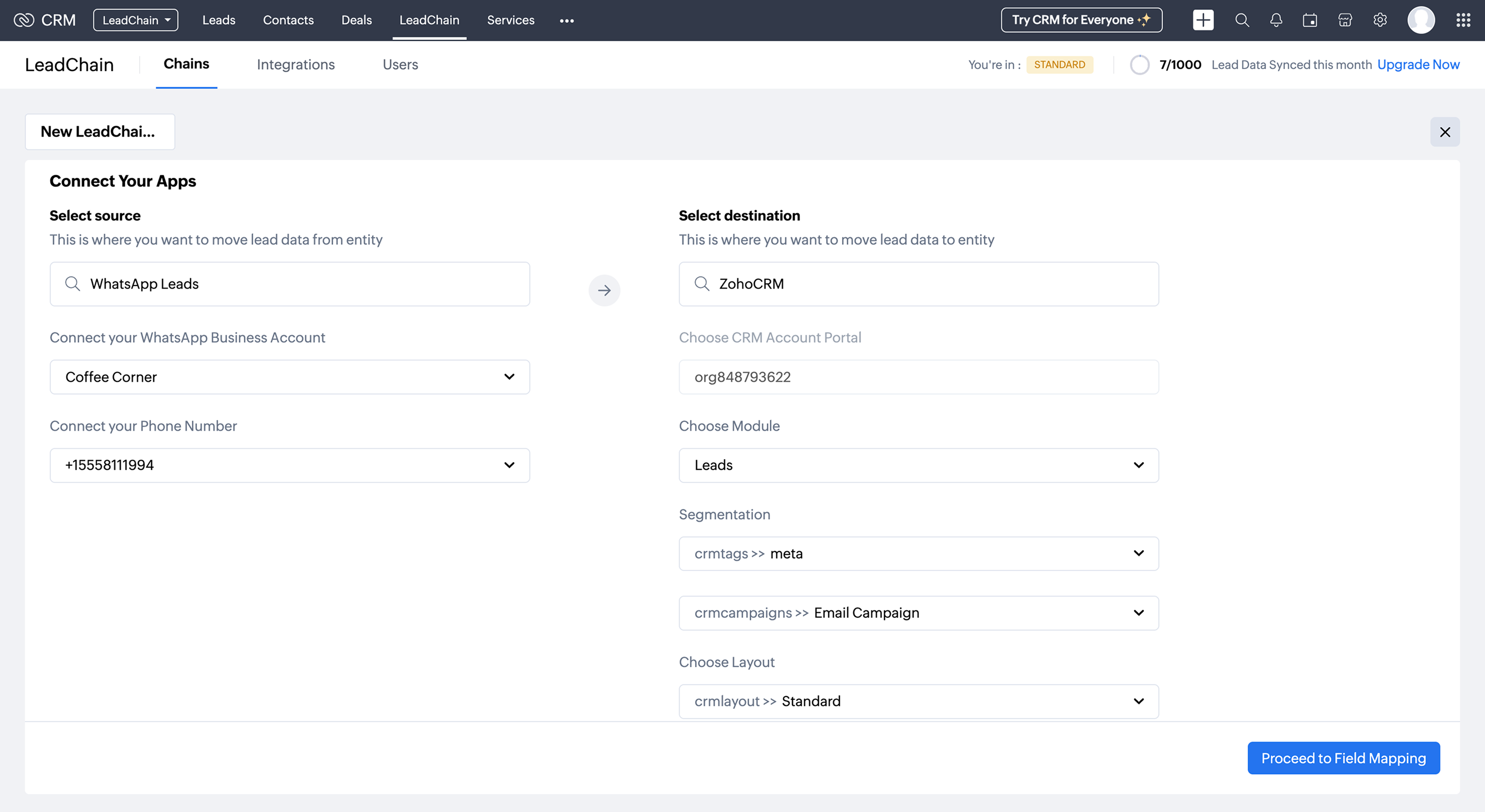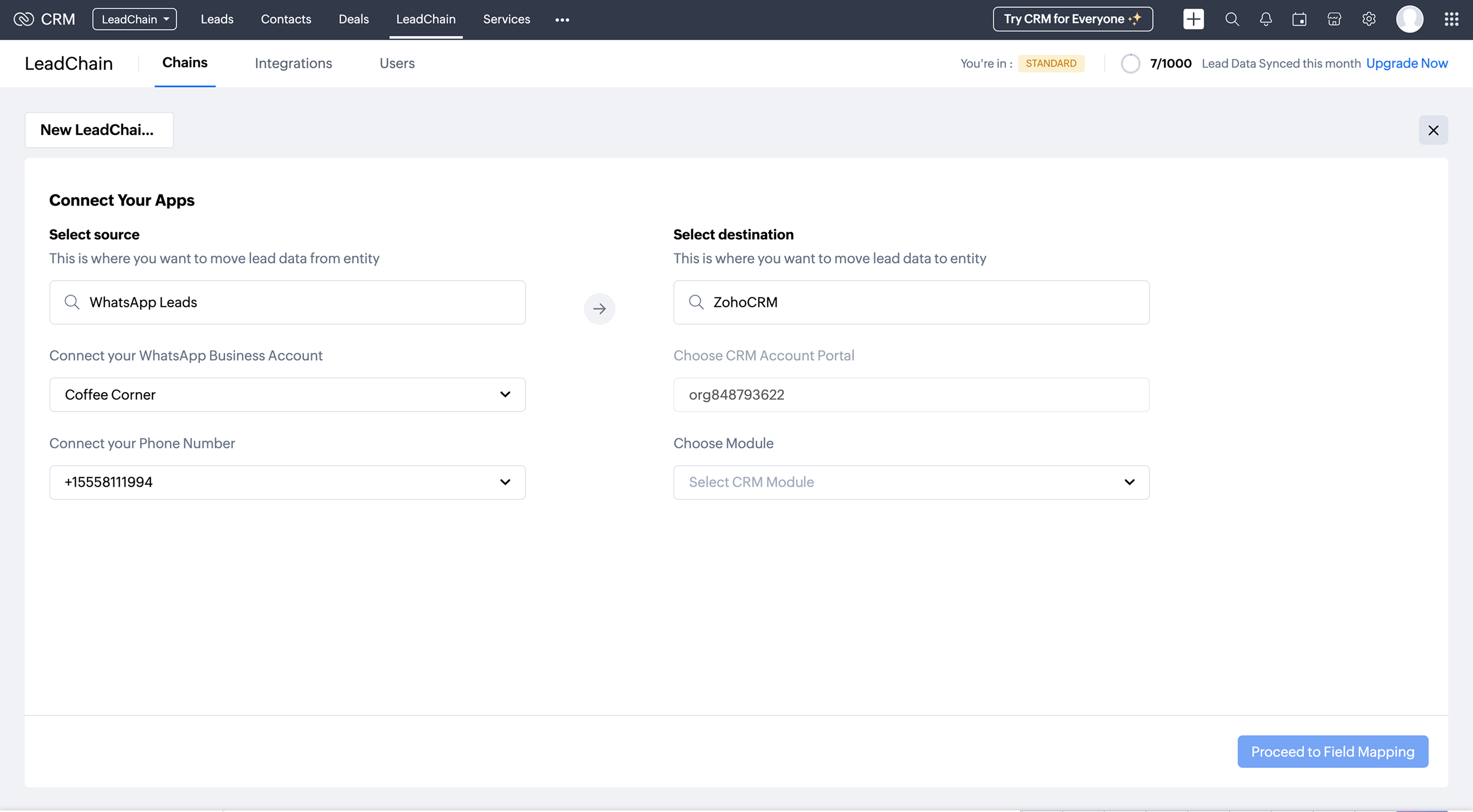 This is the stage where you map the source (Whatsapp Lead Ads) and the destination (Zoho CRM).