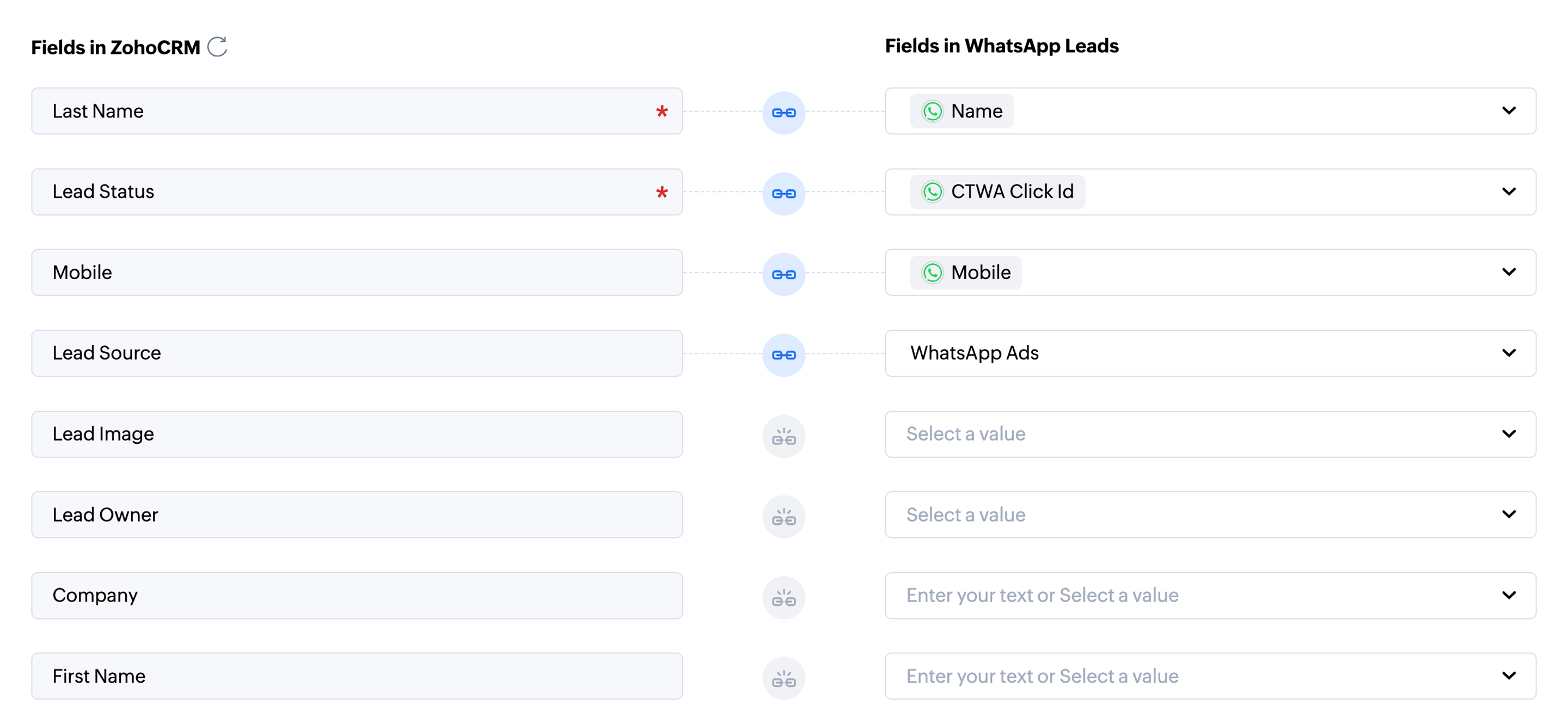 - Map the fields in Zoho CRM with the fields from Whastapp Lead Ads. Alternatively, you can also enter a default field value.