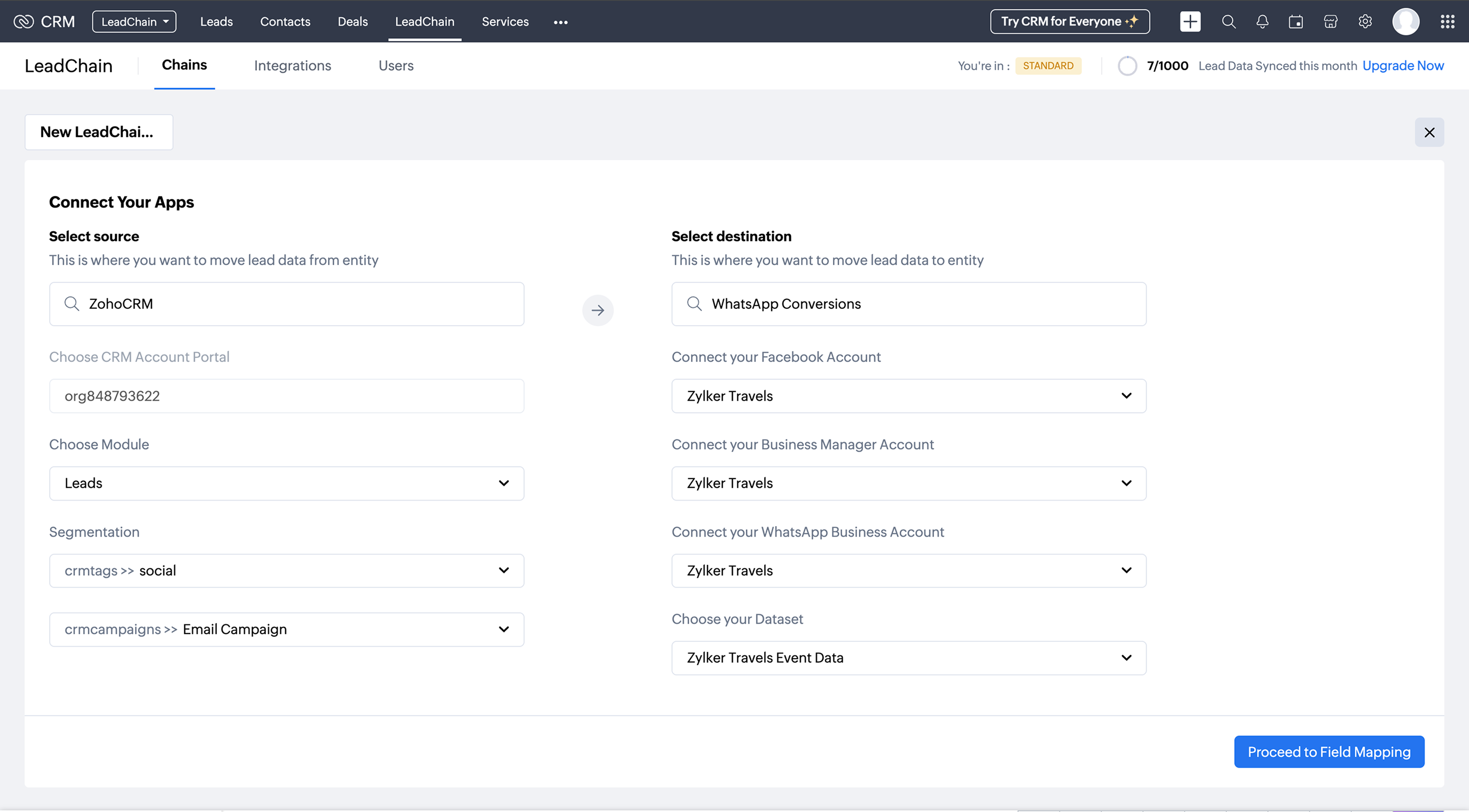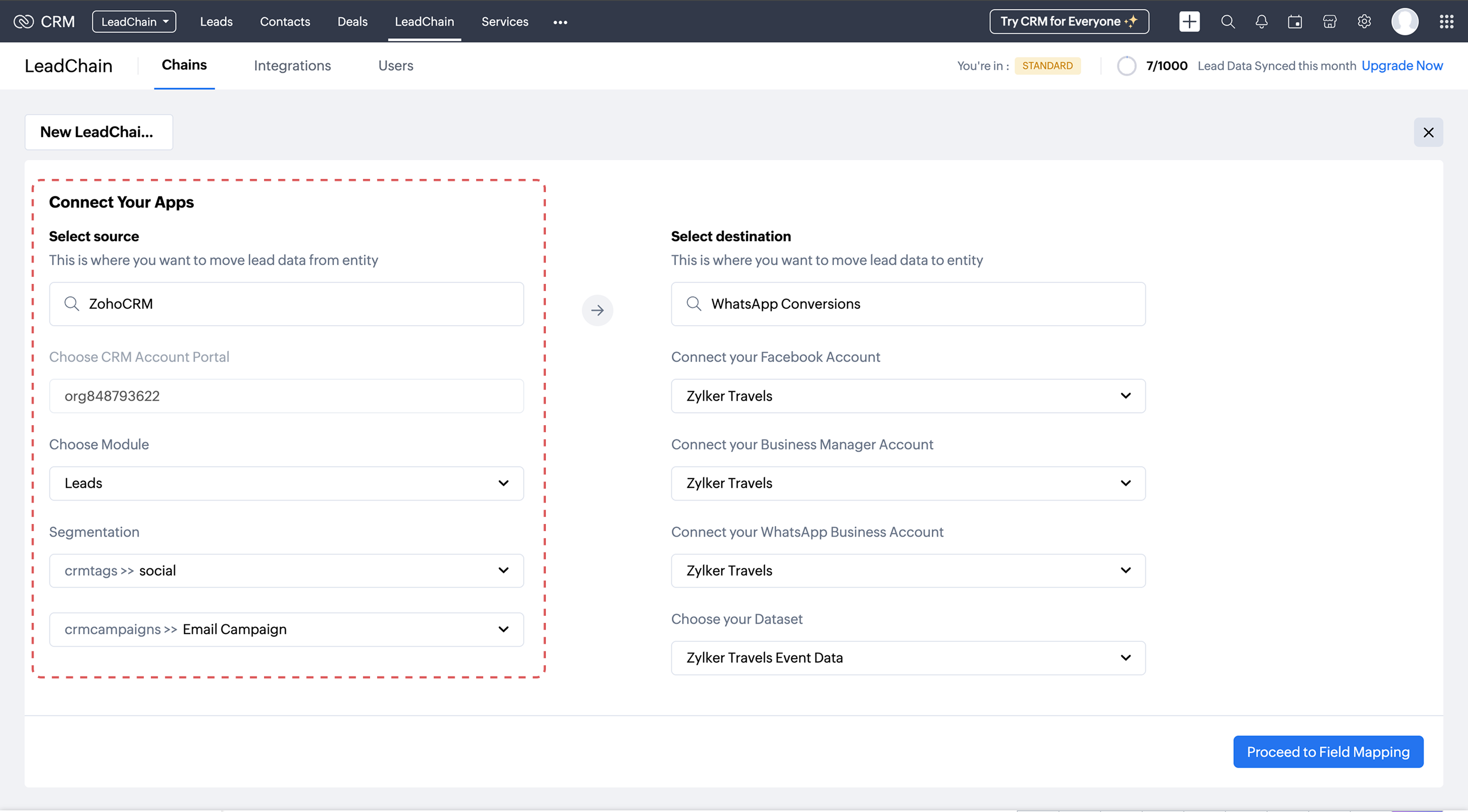 This is the stage where you map the source (Zoho CRM) and the destination (Whatsapp ads).